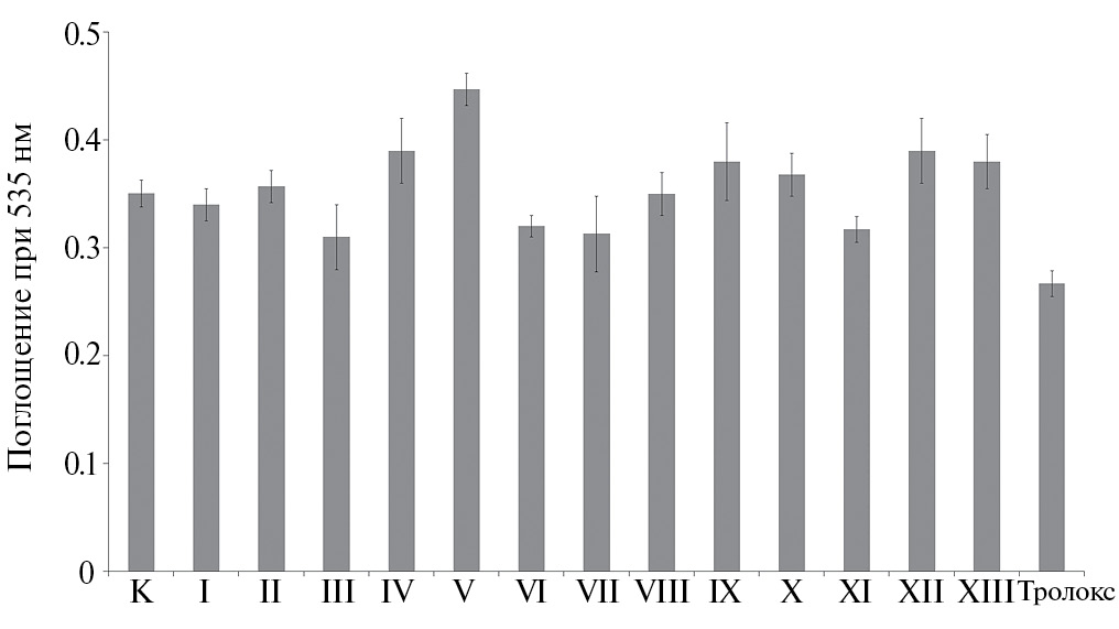 Оценку антирадикальной, антиоксидантной активности соединений в реакции с катион-радикалом АБТС∙+ проводили по известной методике [34]. Фиксировали изменение интенсивности поглощения АБТС∙+ (λ = 734 нм), генерированного при действии K2S2O8, в присутствии различных концентраций комплексов олова (5–100 µмоль/л). Величину IC50 рассчитывали как минимальную концентрацию соединений, необходимую для снижения содержания АБТС∙+ на 50% от исходного показателя. Для исследуемых комплексов и Тролокса определяли графики зависимости поглощения от концентрации в АБТС-тесте. Значения антиоксидантной емкости (АБТСTEAC) в эквивалентах Тролокса (Trolox Equivalent Antioxidant Capacity, TEAC) измеряли, сравнивая угол наклона графиков, полученных для каждого соединения, с данными для Тролокса.