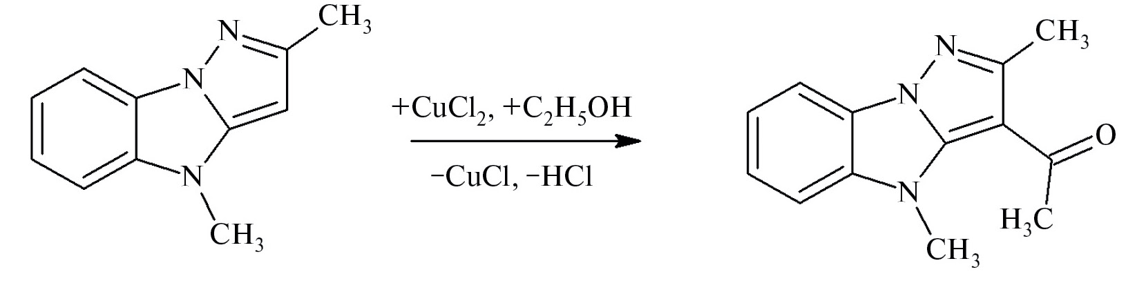 Схема 2. Превращение 2,4-диметилпиразоло[1,5-а]бензимидазола в 1-(2,4-диметилпиразоло[1,5-а]бензимидазол-3-ил)этанон).