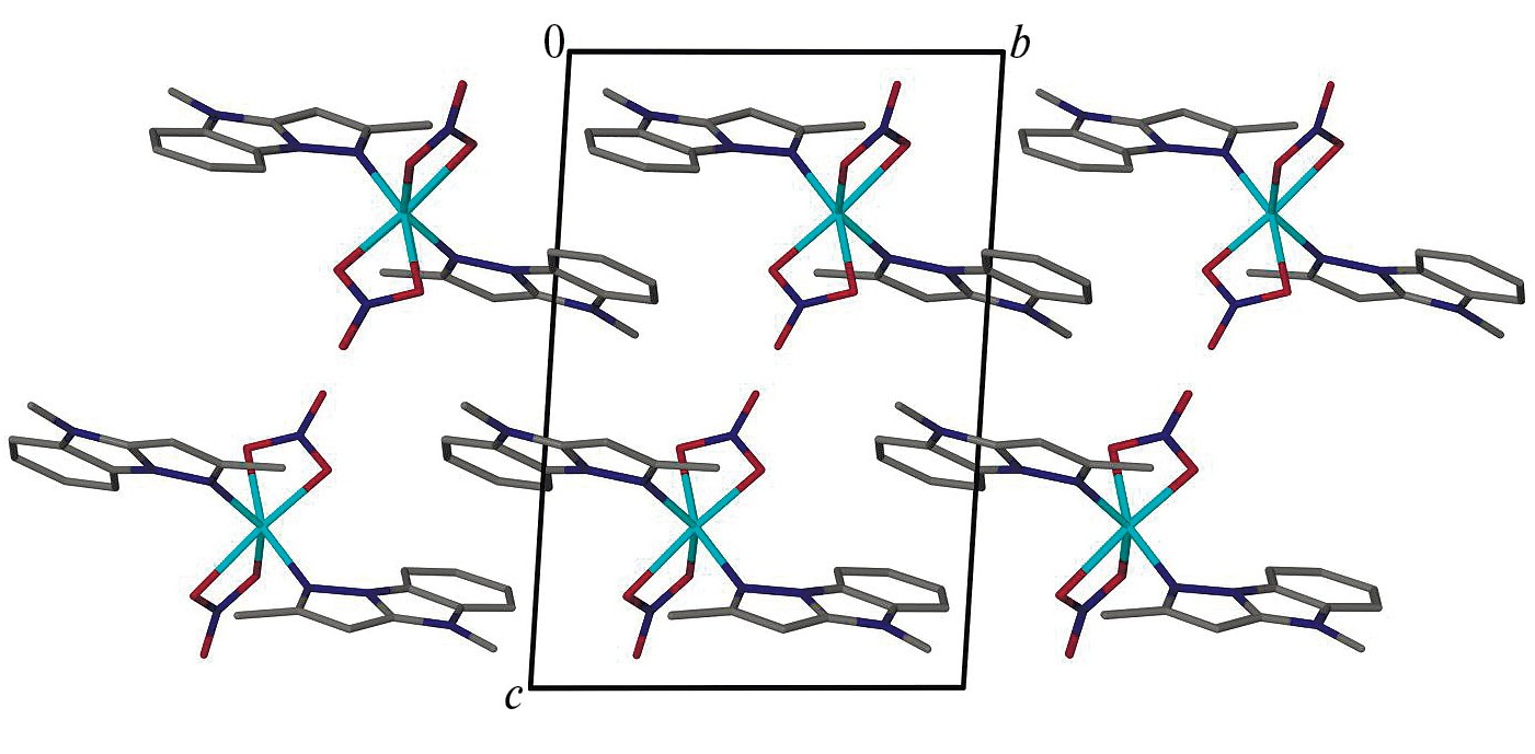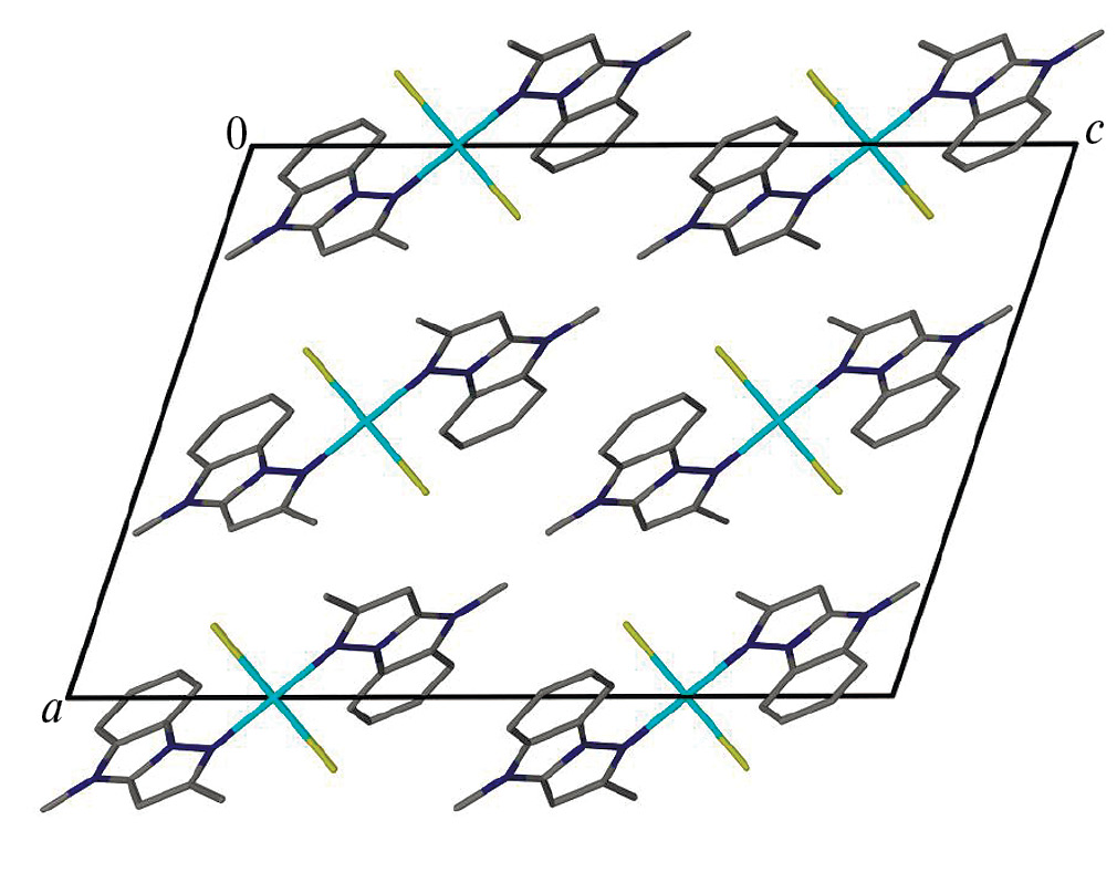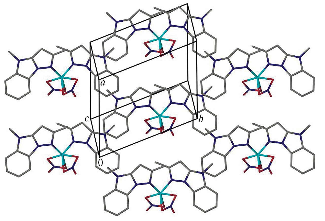 Упаковку молекулярных комплексов можно представить как искаженную гексагональную шаровую упаковку типа ABAB вдоль параметра c (рис. 3). Расстояния Cu…Cu внутри такого псевдогексагонального слоя изменяются в диапазоне 7.940–8.124(1) Å, а углы CuCuCu ближайших центров комплексных частиц — в диапазоне 58.5˚–60.75˚, что говорит о малом искажении упаковки согласно внешней форме частиц. В структуре также наблюдается согласование ориентации плоских частей органических лигандов соседних молекулярных комплексов, но полноценного стекинга не наблюдается из-за значительного смещения ароматических систем друг относительно друга.