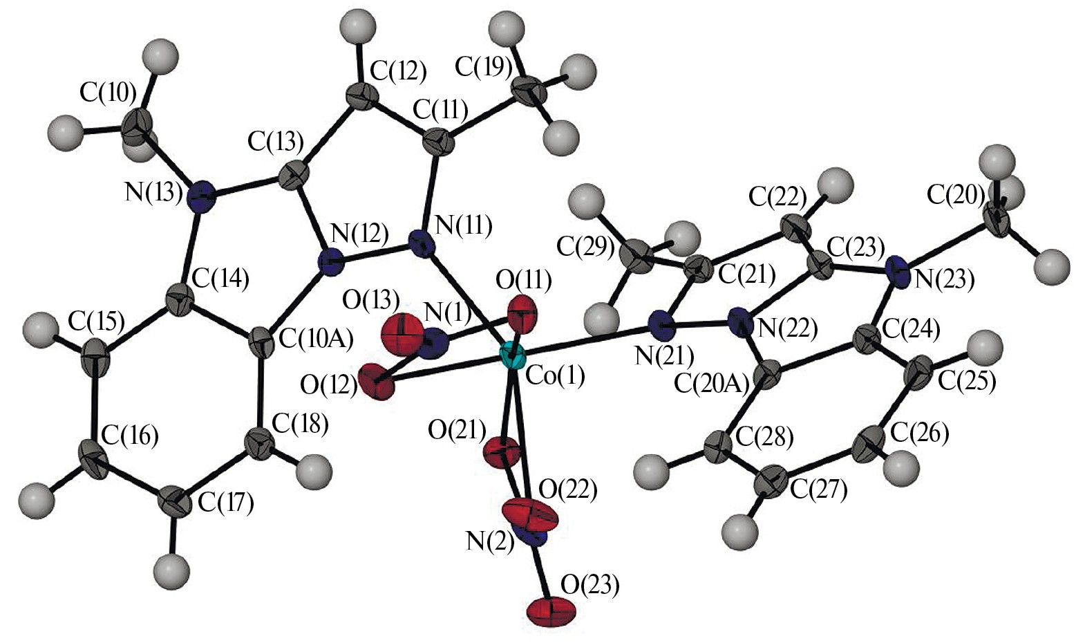 Рис 4. Молекулярное строение комплекса [CoL2(NO3)2].