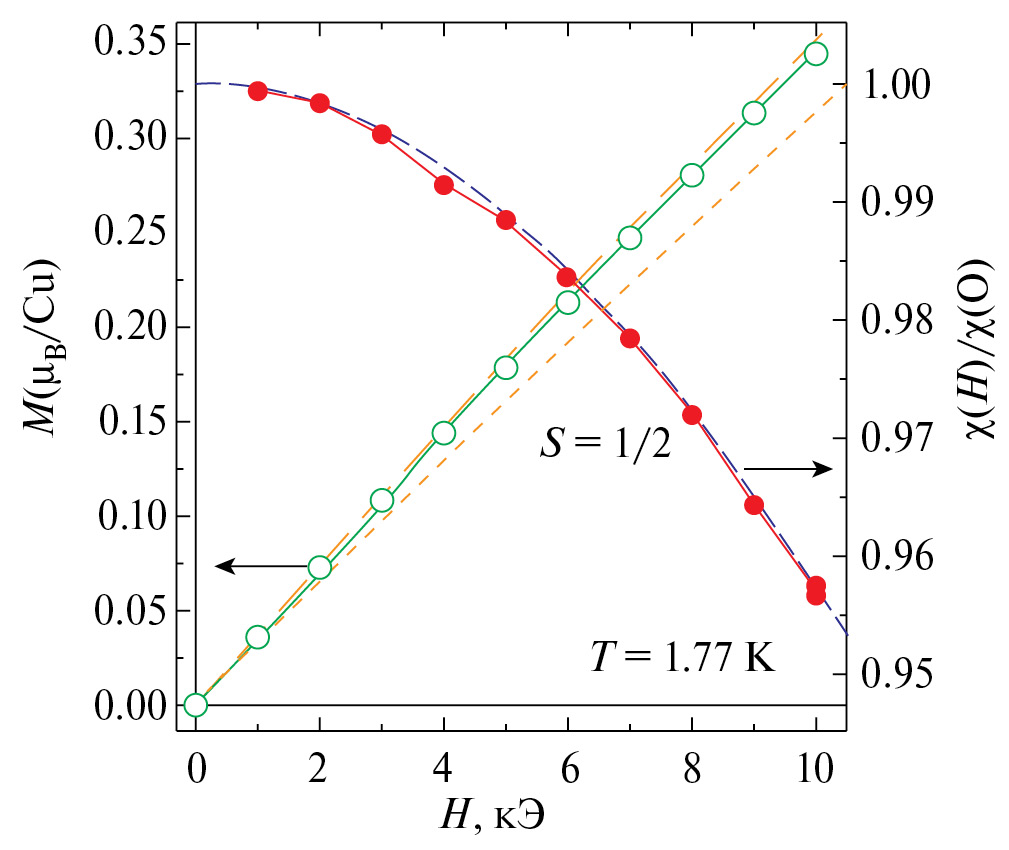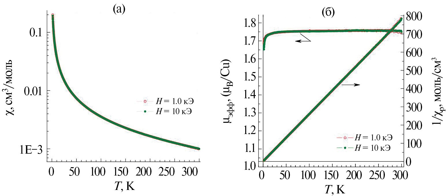 Магнетохимическое исследование образца III демонстрирует парамагнитное поведение во всем исследованном диапазоне температур 1.77–300 K (рис. 9). В интервале Т = 20–300 K, температурная зависимость магнитной восприимчивости, измеренная в полях H = 1, 10 кЭ, хорошо описывается формулой Кюри–Вейсса χp(T) = NA µ2эфф/3kB(T – θ) с эффективным магнитным моментом µэфф ≈ 1.76 µВ и константой Вейсса θ ≈ –0.4 K. Полученная величина µэфф близка к теоретическому чисто спиновому значению µэфф (Cu2+) ≈ 1.73 µВ для ионов меди Cu2+ (S = 1/2), а значение константы Вейсса соответствует слабому антиферромагнитному (АФМ) обменному взаимодействию J между ионами меди Cu2+. В модели среднего поля для изотропного обменного взаимодействия величина θ описывается выражением где z — число ближайших соседей в магнитной подрешетке, kB — константа Больцмана. Соответственно, в этом приближении значение zJ/kB ≈ 0.8 K.