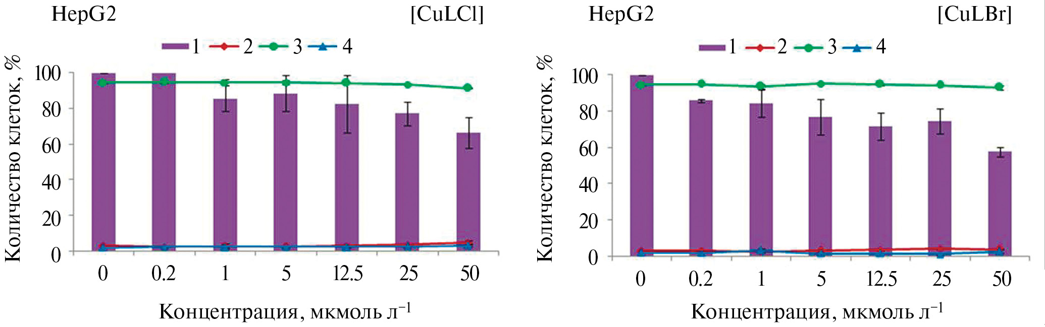 Рис. 11. Влияние исследуемых соединений на жизнеспособность клеток HepG2: 1 — количество клеток, 2 — мертвые клетки, 3 — живые клетки, 4 — апоптотические клетки.