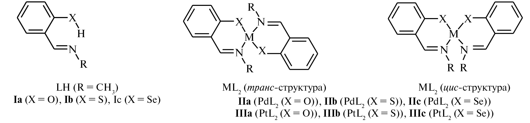 Молекулярное строение, спектральные и другие физико-химические свойства (магнитные, фотофизические, каталитические) тетракоординированных бис-хелатных комплексов переходных d8(Ni2+, Pd2+, Pt2+)-металлов с (N, O)-, (N, S)- и (N, Se)-бидентатными азометиновыми лигандами определяются электронной конфигурацией центрального атома металла, природой донорных атомов (составом координационного узла MN2X2 (X = O, S, Se)) и структурными особенностями лигандов [1–3]. Ранее [1] для бис-хелатных комплексов Ni(II) с (N, O)-, (N, S)- и (N, Se)-бидентатными азометиновыми лигандами экспериментально зафиксирована закономерность в формирования их структуры: транс-строение комплексов NiL2 с координационным узлом NiN2O2 и цис-строение комплексов с координационным узлом NiN2S2 и NiN2Se2. Эта закономерность была теоретически интерпретирована на основе учета термодинамического [4, 5] в сочетании с кинетическим [6] фактором формирования бис-хелатных комплексов этого типа. Аналогичная схема построена в настоящей работе для процессов конкуренции формирования транс- и цис-изомеров тетракоординированных бис-хелатных комплексов PdL2 и PtL2 на основе салицилаль-, тиосалицилаль- и селеносалицилальдииминов Ia (X = O), Ib (X = S) и Ic (X = =Se) соответственно (схема 1).