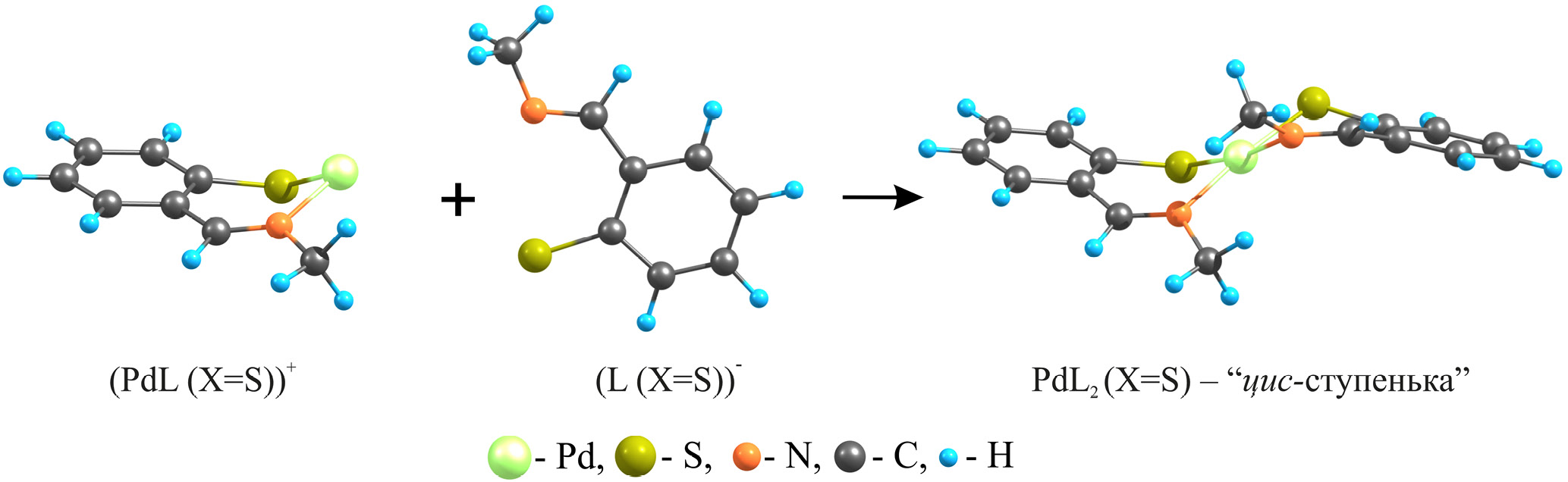 На схеме 3 представлены рассчитанные методом DFT/B3LYP/SDD молекулярные структуры катиона (PdL(X = S))+, аниона второго лиганда (L(X = S))– и продукта реакции комплексообразования — цис-изомера комплекса PdL2 (X = S). Для комплексов PdL2 (X = Se) и PtL2 (X = S, Se) изображение кинетической модели второй стадии реакции (1) визуально практически совпадает с изображением, приведенным на схеме 3.