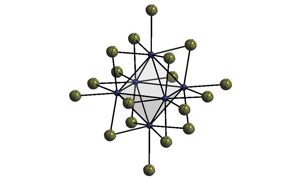 Рис. 1. Кластерный анион [Ta6Br18]4– как пример координационного фрагмента [{M6X12}L6] (M = Ta (синий), X = L = Br (зеленый))