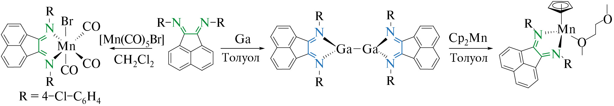 Синтезирован карбонильный комплекс Mn(I) состава fac-[Mn(4-Cl-C6H4-bian)(CO)3Br] (схема 2), для которого обнаружена фотоактивируемая способность высвобождения CO [28]. При взаимодействии [Ga2(Dpp-bian)2] с Cp2Mn в толуоле и последующей его перекристаллизацией из диметоксиэтана получен комплекс состава [CpMn(Dpp-bian)(Dme)] (схема 2) с анион-радикалом Dpp-bian [29].