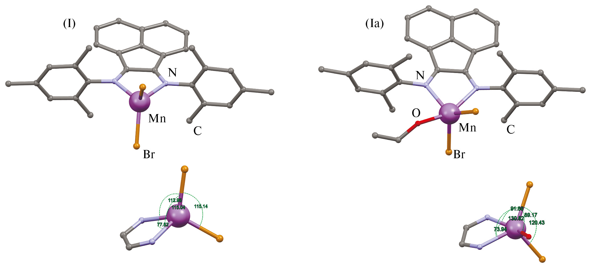 Как уже отмечалось во введении, на данный момент имеются ограниченные сведения о комплексах марганца с лигандами BIAN, тогда как структурно охарактеризованных комплексов насчитываются мало. В описанных структурах расстояния Mn–N варьируются от 2,06 Å в [MnBr(CO)3(BIAN)] [28] до 2,41 Å в [(BIAN)MnCl(μ-Cl)]2 [27] и зависят от типа координационного полиэдра и стерического объема координированных лигандов. Значения расстояний Mn–Br находятся в диапазоне от 2,32 до 2,52 Å. Как видно из табл. 2, расстояния Mn–N и Mn–Br для I и Iа варьируются в этих же пределах. При этом расстояния Mn–N и Mn–Br в I примерно на 0,05 – 0,1 Å меньше, чем в Iа, что можно объяснить большей стерической загруженностью координационной сферы комплекса Ia. Расстояния Mn–N и Mn–O в III также согласуются с литературными данными [28, 40]. Длины связей С–С и С=N дииминового фрагмента во всех структурах однозначно свидетельствуют о нейтральном состоянии Tmp-bian.