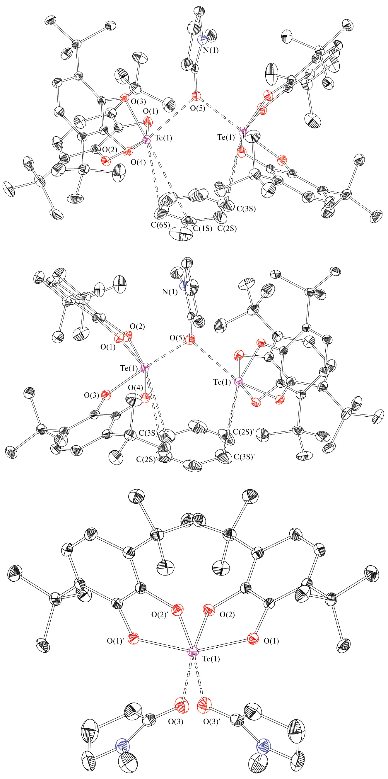 Te–Ocat | 1.9441(13), 2.0099(13), 1.9469(12), 2.0424(13) | 1.9518(12), 2.0168(12), 1.9491(12), 2.0091(13) | 1.9560(10), 2.0314(10) |