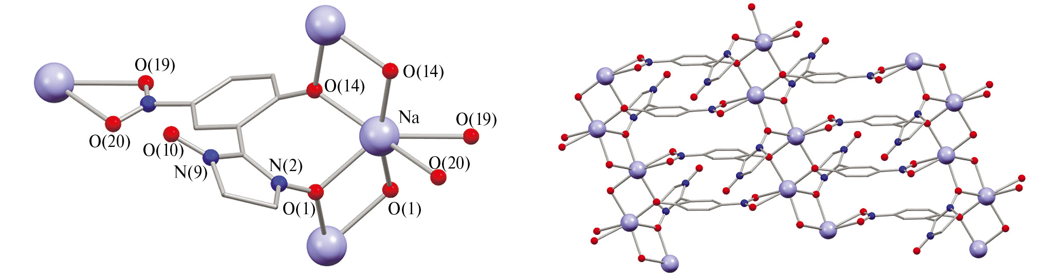 Соль NaL удалось получить в виде твердой фазы только после перекристаллизации из ацетона продукта взаимодействия HL с NaHCO3 в метаноле. В кристалле искаженно-октаэдрическое окружение атома Na образуют шесть атомов кислорода — 2OPh + 2ONO + 2ONO2 с расстояниями 2.282(1)–2.376(1) Å (табл. 2). При этом OPh и ONO связывают по два атома Na (рис. 3) в плоских центросимметричных циклах {Na(O)2Na} с углами при атомах кислорода, равными 110.1° при OPh и 100.4° при ONO. В окружении атома Na расстояние ONO…ONO равно 2.714 Å, тогда как между «свободными» атомами ONO — это атомы из соседних слоев — они превышают 6 Å.