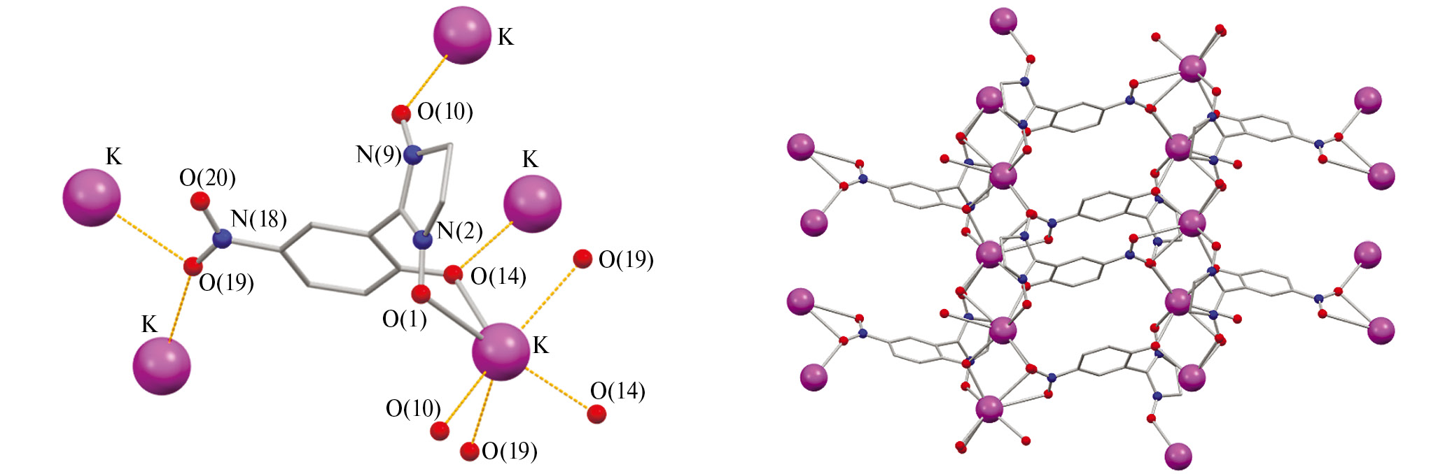 Структуры KL, [KL(MeOH)] и [KL(CH3CN)] слоистые. В KL анион L связывает пять атомов K (рис. 4) с расстояниями K–ONO и K–OPh 2.655–2.822 Å, дополняющих его окружение до тригональной призмы K–ONO2 2.901 и 2.930 Å (табл. 4). В структуре колонки атомов K разделены нитрофенольными фрагментами L. Внутри колонок нитронилнитроксильные фрагменты являются мостиками между атомами K со слегка отличающимися расстояниями K–ONO (2.750 и 2.822 Å) и значениями углов KONON (113.8 и 135.7°), но эти различия не влияют на длины связей в группах N–O.