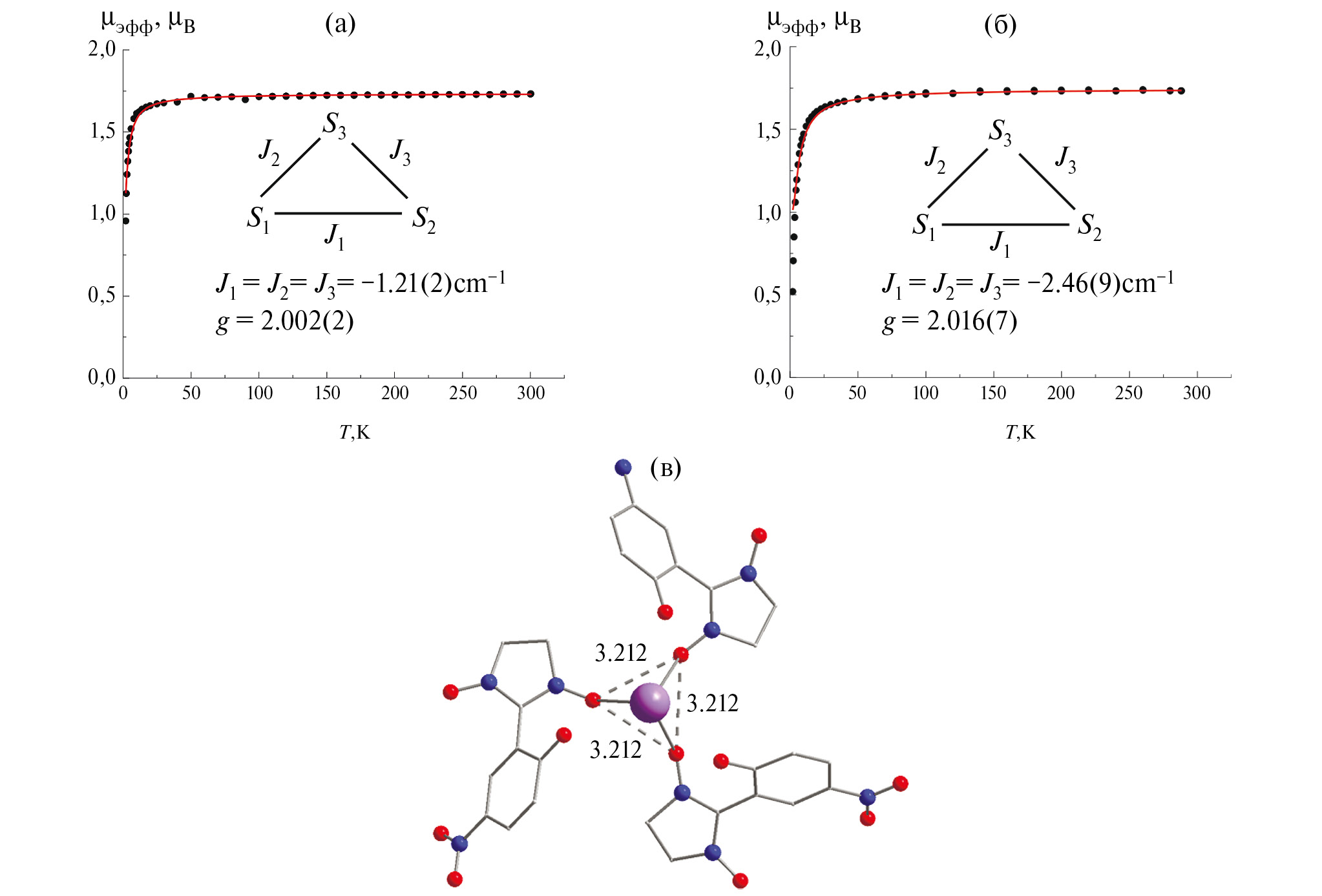 В изоструктурных солях [KL(H2O)] и [RbL(H2O)] выделяются обменно-связанные тримеры с расстояниями ONO…ONO, соответственно, 3.212 и 3.339 Å (на рис. 9 в качестве примера показан тример в структуре [KL(H2O)]), в которых обменные взаимодействия между анион-радикалами реализуются через ион щелочного металла. Оптимальные значения g-факторов и параметров обменного взаимодействия, полученные при анализе экспериментальных зависимостей µэфф(T) составляют 2.016 и –2.46 см–1 для [KL(H2O)] и 2.002 и –1.21 см–1 для [RbL(H2O)] (спин-Гамильтониан H = –2J(S1S2 + S2S3 + S3S1)).