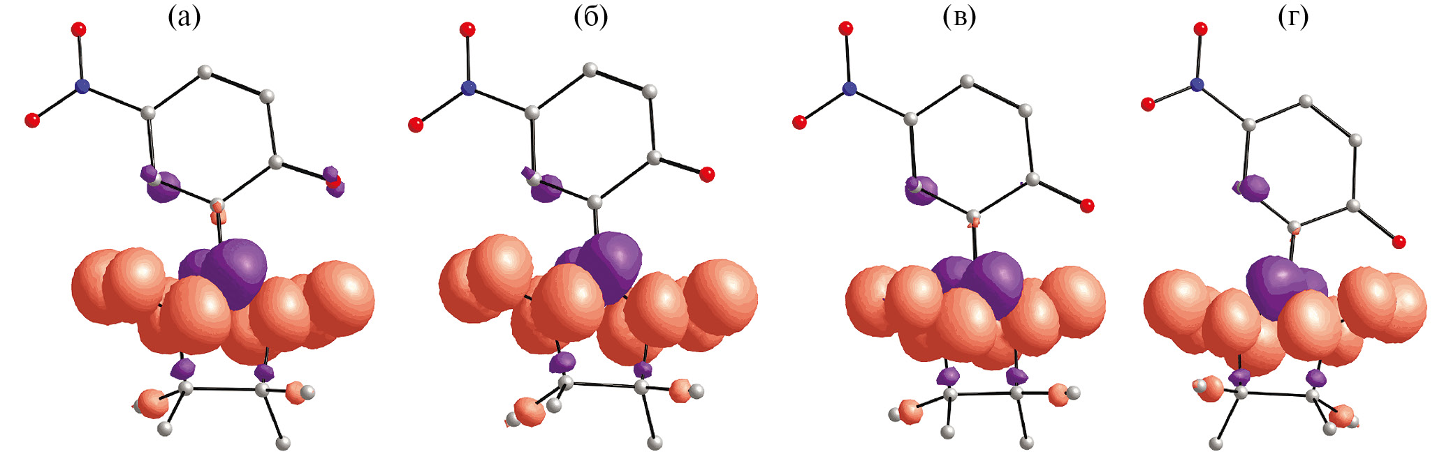 Рис. 10. Распределение спиновой плотности (поверхности с изозначением 0.0025 e/Å3) в анион-радикалах L в соединениях LiL (а), NaL (б), [KL(H2O)] (в) и [RbL(H2O)] (г). Спиновая плотность с положительным знаком показана оранжевым цветом, с отрицательным — фиолетовым. Атомы H были не показаны