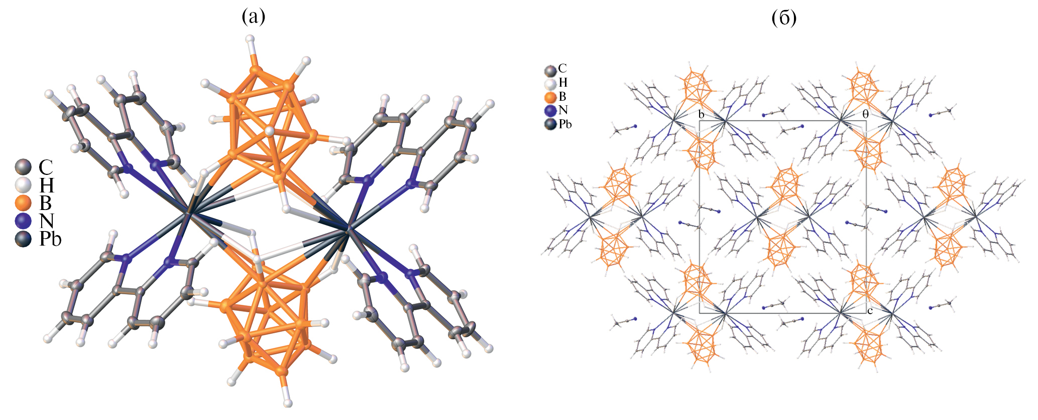 Согласно данным РСА, комплекс I · CH3CN представляет собой биядерный комплекс свинца(II), в котором два атома металла связаны двумя клозо-декаборатными анионами в качестве мостиковых лигандов и координируют по две молекулы Bipy в качестве терминальных лигандов, образуя димерный комплекс [Pb2(Bipy)2[B10H10]2 · 2CH3CN (рис. 1а). Каждый атом свинца координирует клозо-декаборатный анион по одному апикальному (B(1) B(3)) и одному экваториальному (B(2) B(3)) ребру борного полиэдра за счет образования четырех (3c2e)-связей PbHB; расстояния Pb–B лежат в диапазоне 3.131–3.447 Å, а расстояния Pb–H — в диапазоне 2.580–3.074 Å. Указанные расстояния Pb–B и Pb–H соответствуют аналогичным дистанциям, обнаруженным в структурах комплексов свинца с кластерными анионами бора и их замещенными производными [25–34]. Длины связи Pb–N лежат в диапазоне 2.492–2.591 Å.