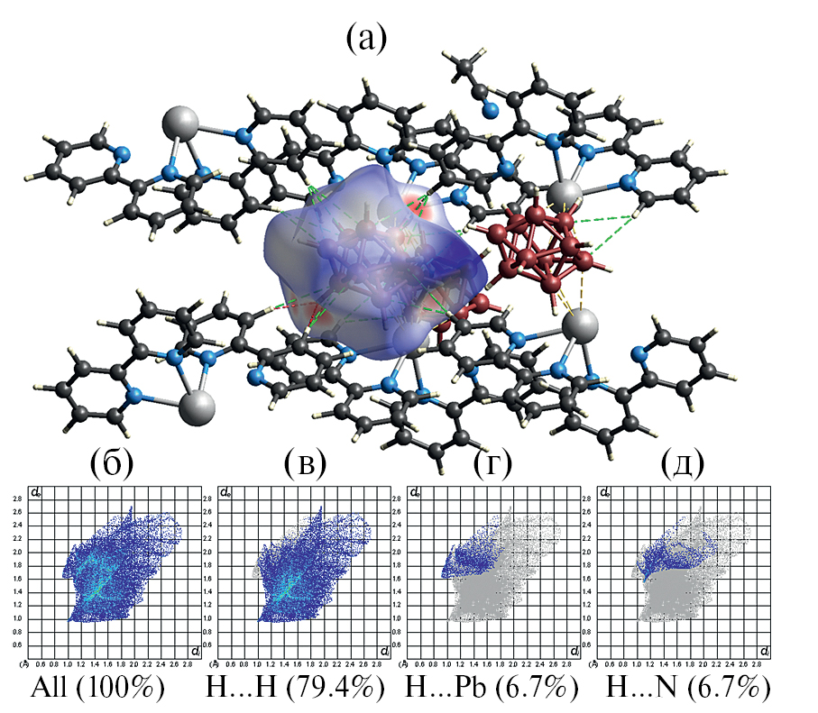 Комплексы связаны между собой в основном за счет контактов CH…HB, которые на поверхности Хиршфельда аниона [B10H10]2– показаны в виде красных пятен и дополнительно обозначены пунктирными красными (H…H-контакты) и зелеными (H…B-контакты) линиями (рис. 2). Красные пятна на поверхности Хиршфельда соответствуют контактам с расстоянием между атомами, меньшим суммы их ван-дер-ваальсовых радиусов, белые пятна с расстояниями, лежащими на границе ван-дер-ваальсовых радиусов атомов. Анализ 2D-развертки поверхности Хиршфельда показывает, что на H…H-контакты приходится 79.4% поверхности аниона, в то время как на контакты H…Pb и H…N по 6.7% поверхности, а на контакты H…C — 6.1% поверхности аниона.