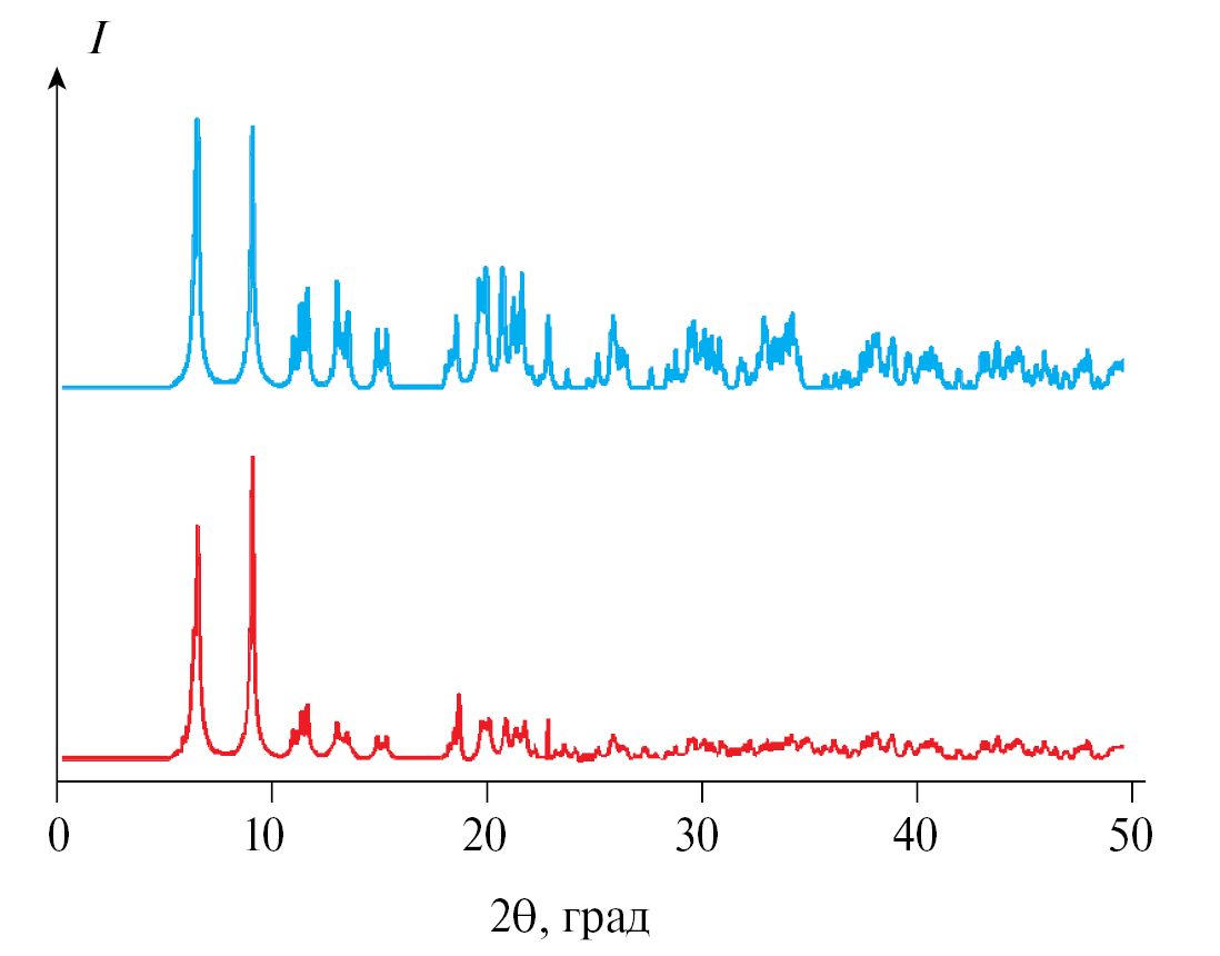 Рис. 3. Теоретическая рентгенограмма комплекса [Pb(Bipy)[B10H10]] [26] (синий) и практическая рентгенограмма комплекса II (красный).