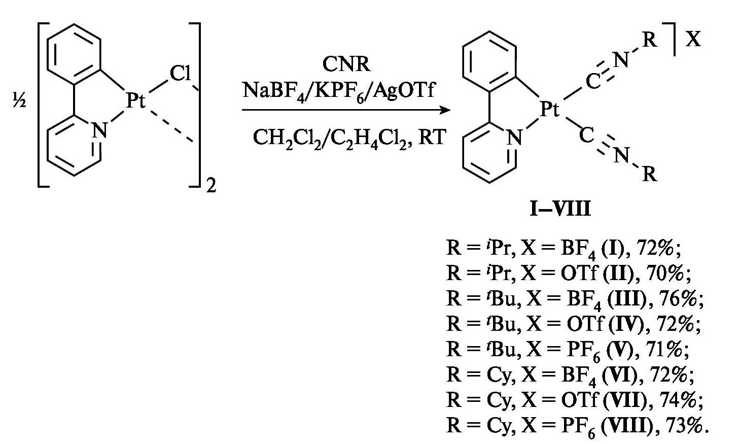 Синтез I–VIII проводили взаимодействием хлормостикового димера [Pt(Рpy)(μ-Cl)]2 со стехиометрическим количеством соответствующего изоцианида CNR (R =iPr,tBu, Cy) в присутствии соли – источника слабокоординирующего аниона (схема 1).
