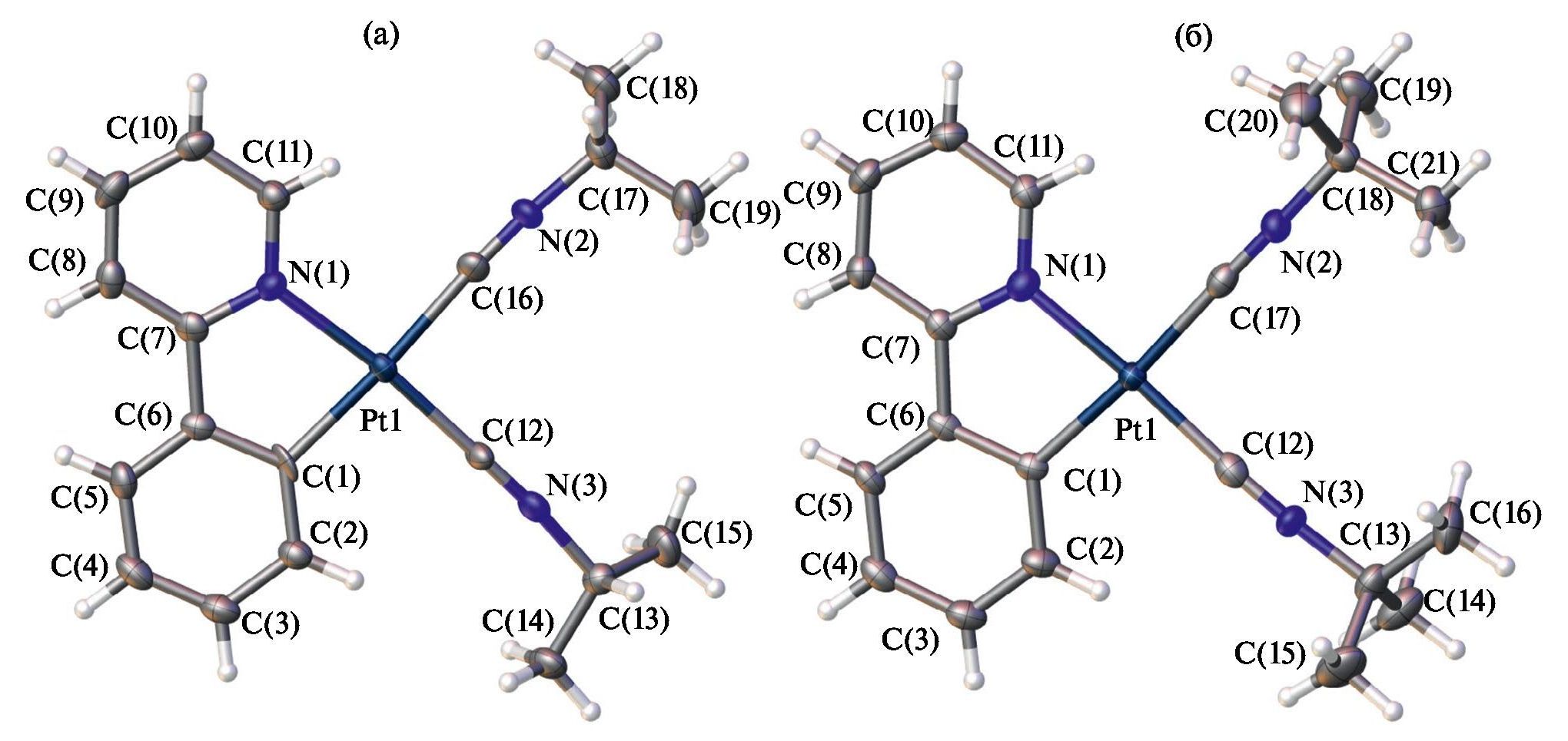 По данным РСА, I ⋅ ½CHCl3 и III имеют в твердой фазе ионный характер; во всех структурах кристаллографически независимая часть представлена одним металлорганическим катионом [Pt(Рpy)(CNR)2]+ и анионом BF4–. Координационная сфера металла имеет плоско-квадратную геометрию, сформированную одним циклометаллированным и двумя изоцианидными лигандами (рис. 1). Длины связей Pt–CРpy и Pt–NРpy и угол CРpy–Pt–NРpy находятся в стандартном диапазоне для связей этого типа и согласуются со значениями в других соединениях типа [Pt(Рpy)L2] [26, 27, 33, 34, 39]. Длины связей Pt–CCNR и C≡N сопоставимы с таковыми в других изоцианидных комплексах платины(II) [39–41]. Все прочие длины связей хорошо согласуются со значениями межатомных расстояний в других циклометаллированных изоцианидных комплексах платины(II).