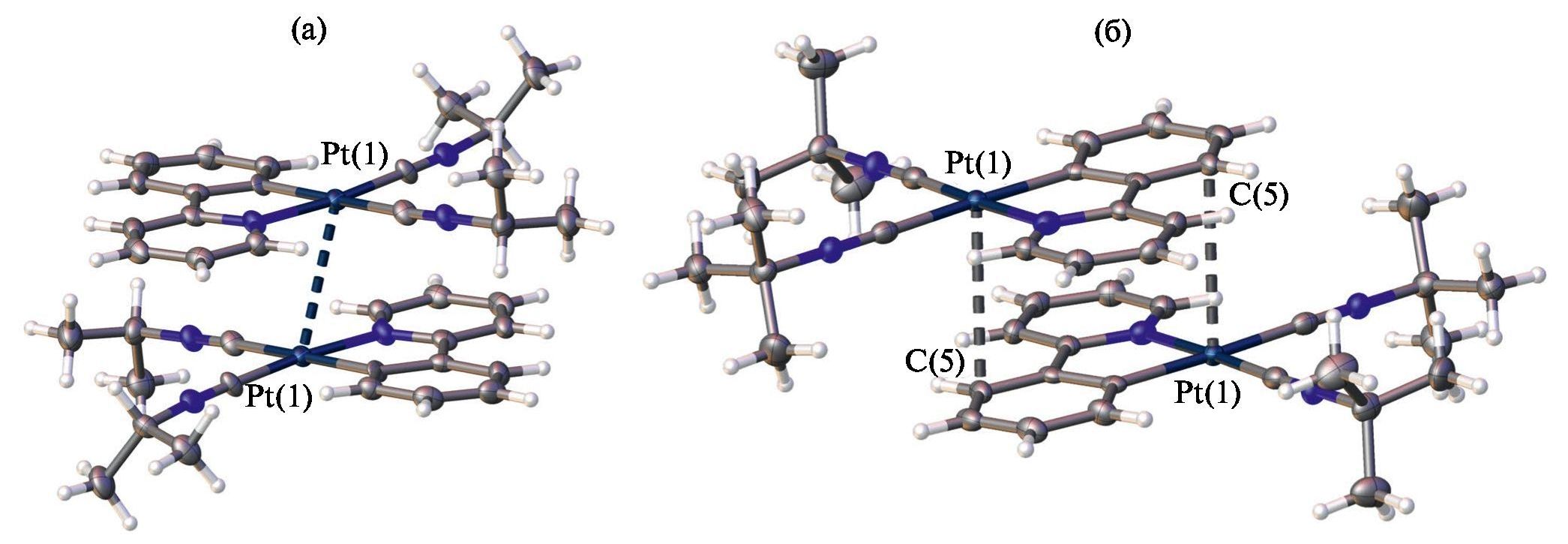 В структуре соединения II расстояния между атомами платины составляет 3.3354(4) Å, что немного меньше удвоенного значения ван-дер-ваальсового радиуса платины, предложенного Бонди (2rвдв(Pt) = 3.44 Å [42], rPt,Pt = d(Pt···Pt) / / 2rвдв(Pt) = 0.97). Таким образом в структуре I, скорее всего, присутствуют слабые металлофильные взаимодействия, однако сделать однозначное заключение можно только на основании квантово-химических расчетов. В структуре соединения III расстояния между атомами платины существенно больше удвоенного значения ван-дер-ваальсового радиуса платины, что указывает на отсутствие металлофильных взаимодействий в этом кристалле (рис. 2).