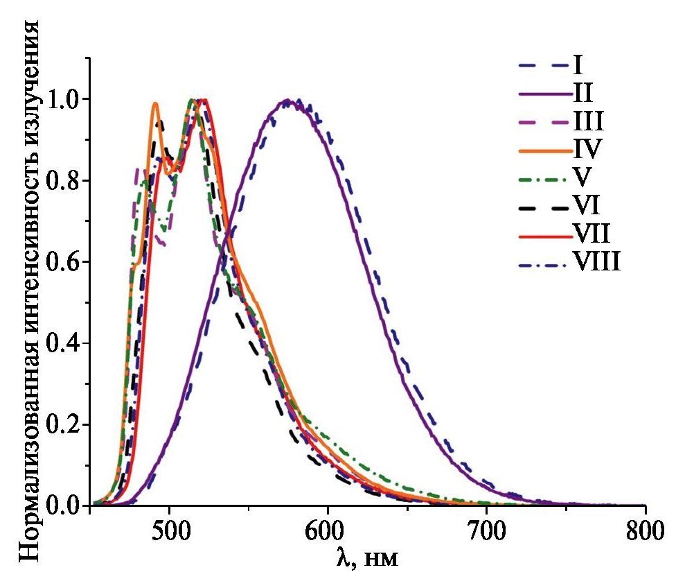 Таблица 2. Данные эмиссии (твердая фаза) комплексов I–VIII