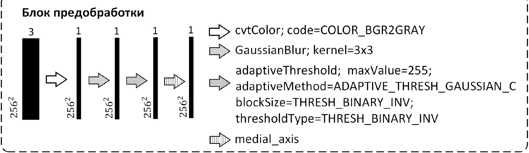 Рис. 1. Схема преобразования RGB-изображения в бинарное изображение. Названия компонентов соответствуют программной библиотеке OpenCV API (https://docs.opencv.org/4.x/) и scikit-image (https://scikit-image.org/). Число по вертикали – размер изображения, по горизонтали – количество каналов.