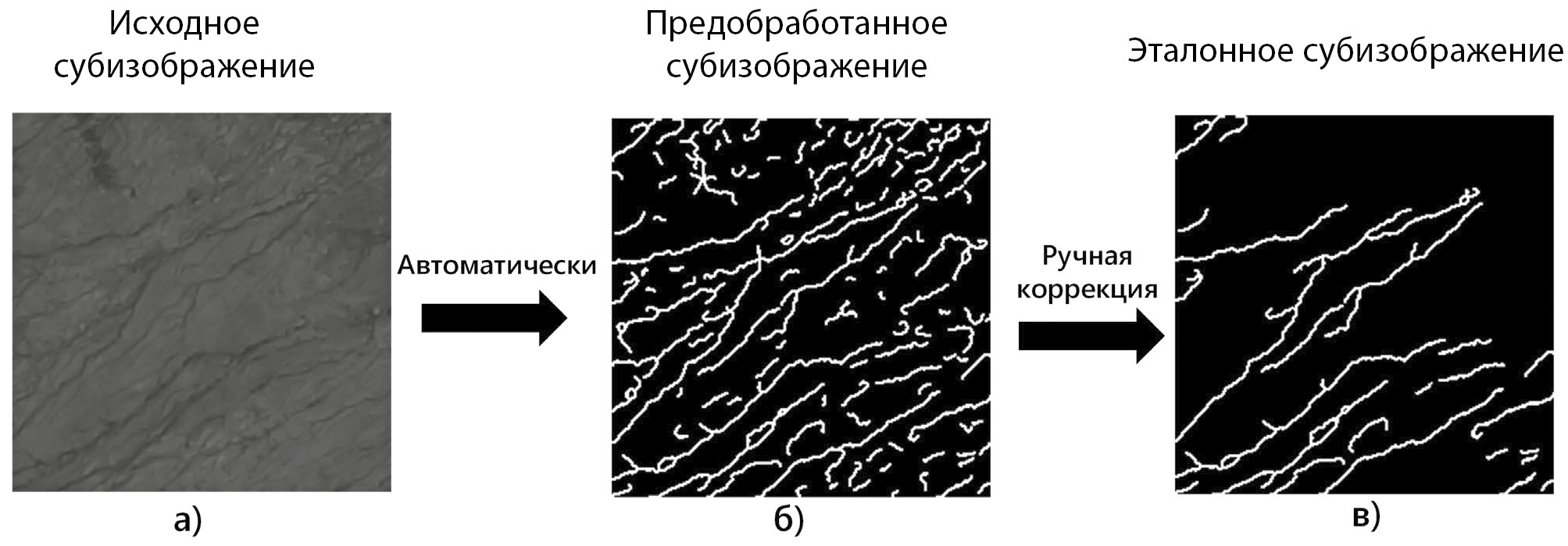 На выходе получаются нормализованные бинарные изображения, пригодные для последующей ручной корректировки в рамках формирования обучающей выборки (рис. 2в).