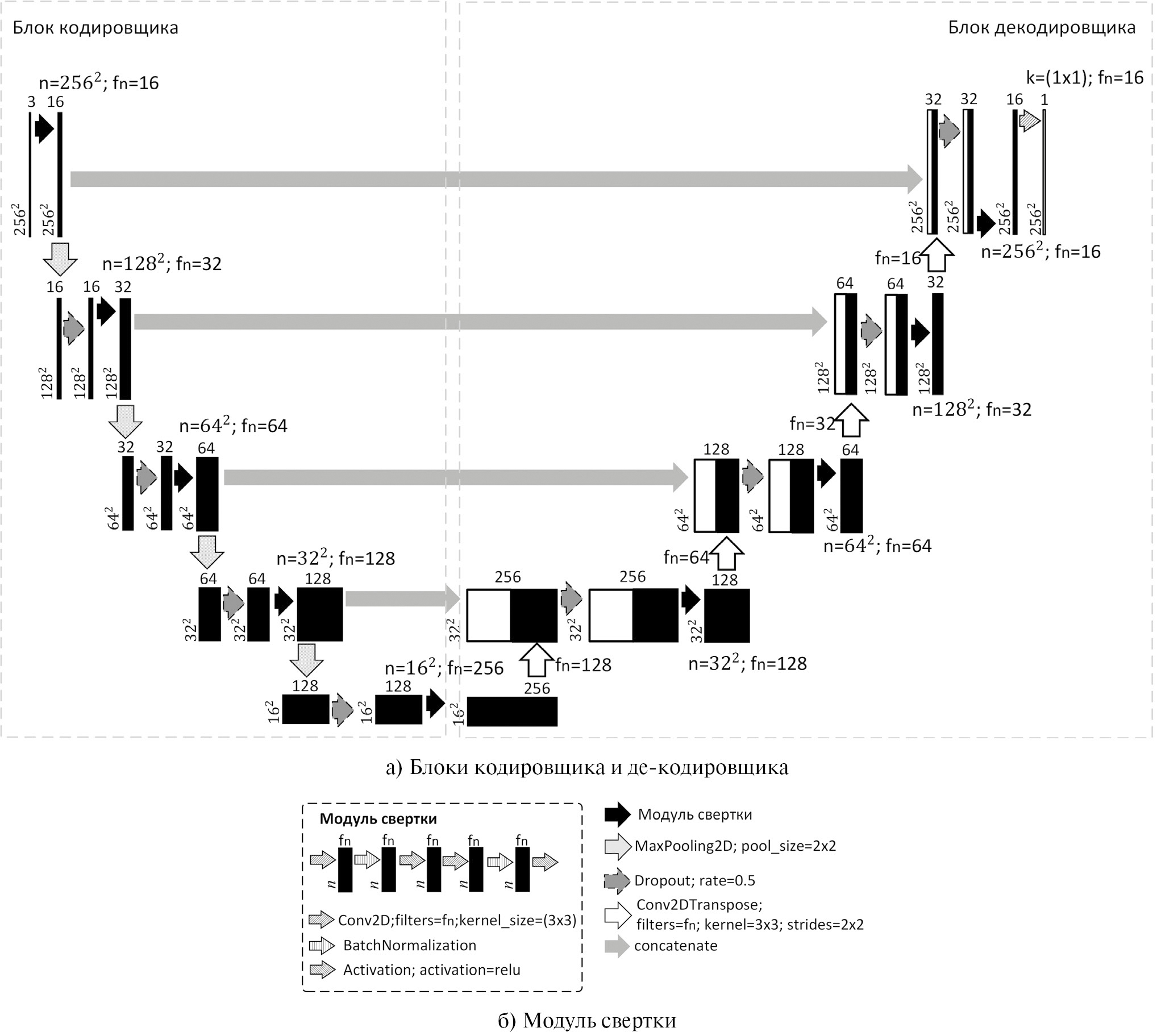 Блок Encoder состоит из модулей свертки, включающих два сверточных слоя (Conv2D) с параметром kernel_size 3×3 (класс tf.keras.layers.Conv2D), слой активации ReLU (класс tf.keras.layers.Activation) и слой нормализации входных данных BatchNorm (класс tf.keras.layers.BatchNormalization). Также используется дополнительный слой пулинга с функцией максимума (параметр pool_size = 2×2) с шагом 2 и слой регуляризации (Dropout) для уменьшения переобучения с 50% исключением (параметр rate). На каждом шаге количество каналов признаков удваивается (параметр filters).