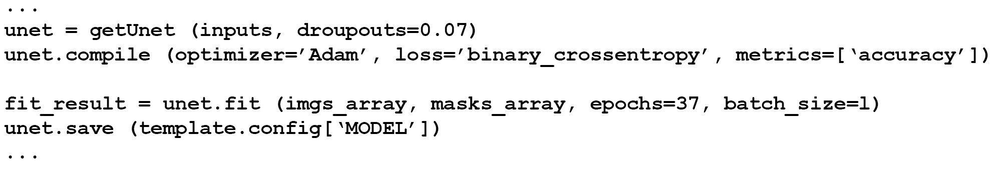 Рис. 6. Фрагмент кода компиляции и старта процесса обучения сети.