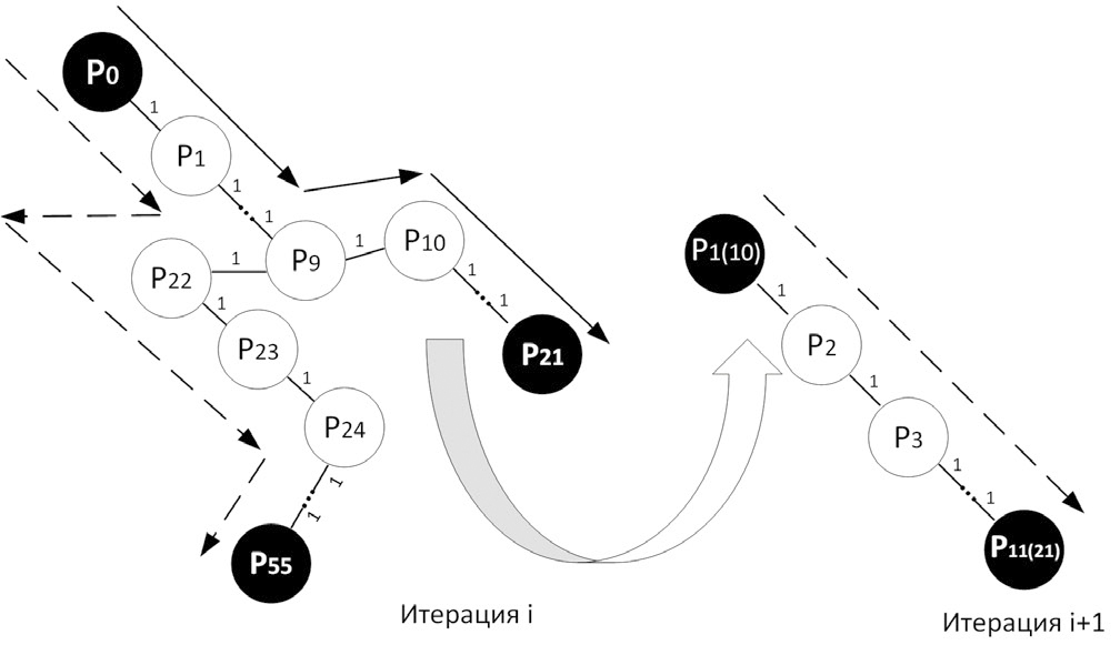 Рис. 10. Пример объекта-графа. Черным обозначены вершины, соответствующие краевым пикселам, стрелками – пути обхода графа между двумя краевыми точками. Штрихованные стрелки – наибольший путь по количеству пикселов на каждой итерации. Ребра графа имеют веса, равные 1.