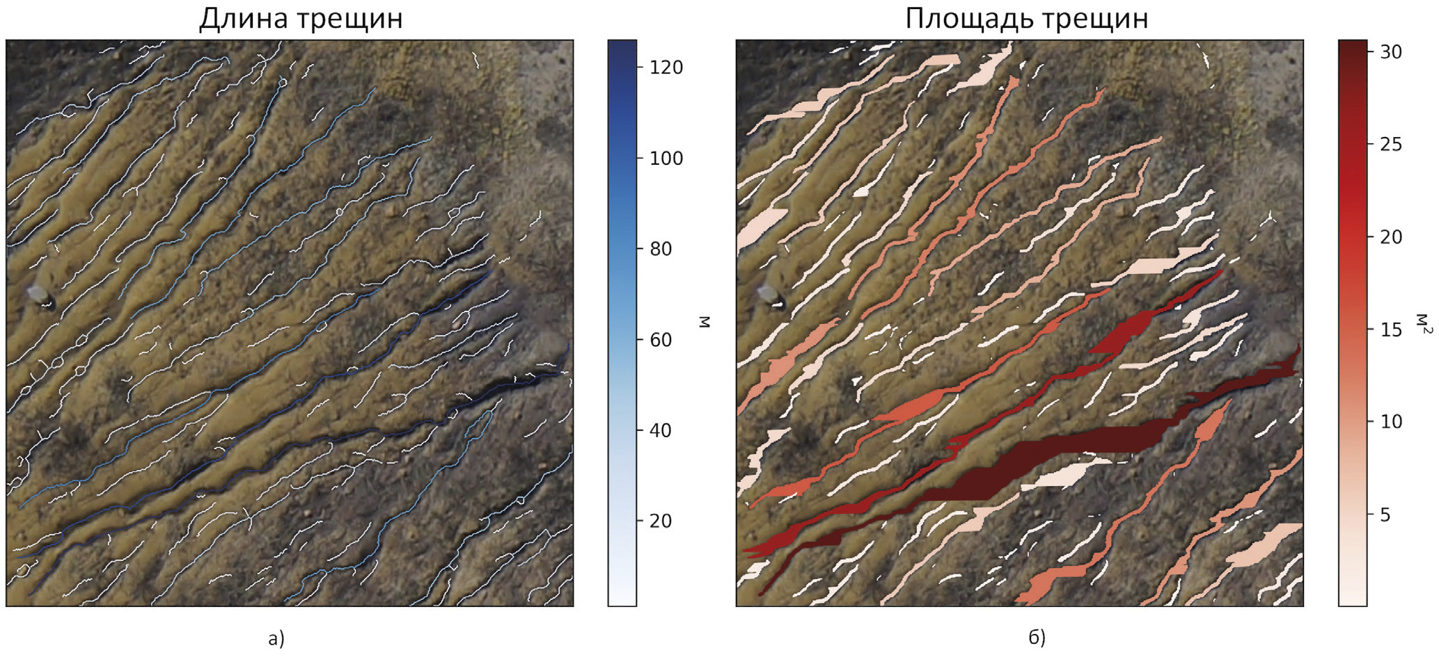 На рис. 11а, б представлен результат расчета длин и площадей трещин на произвольном изображении аэрофотосъемки (на примере угольного карьера Восточный, Кемеровская область, Россия).