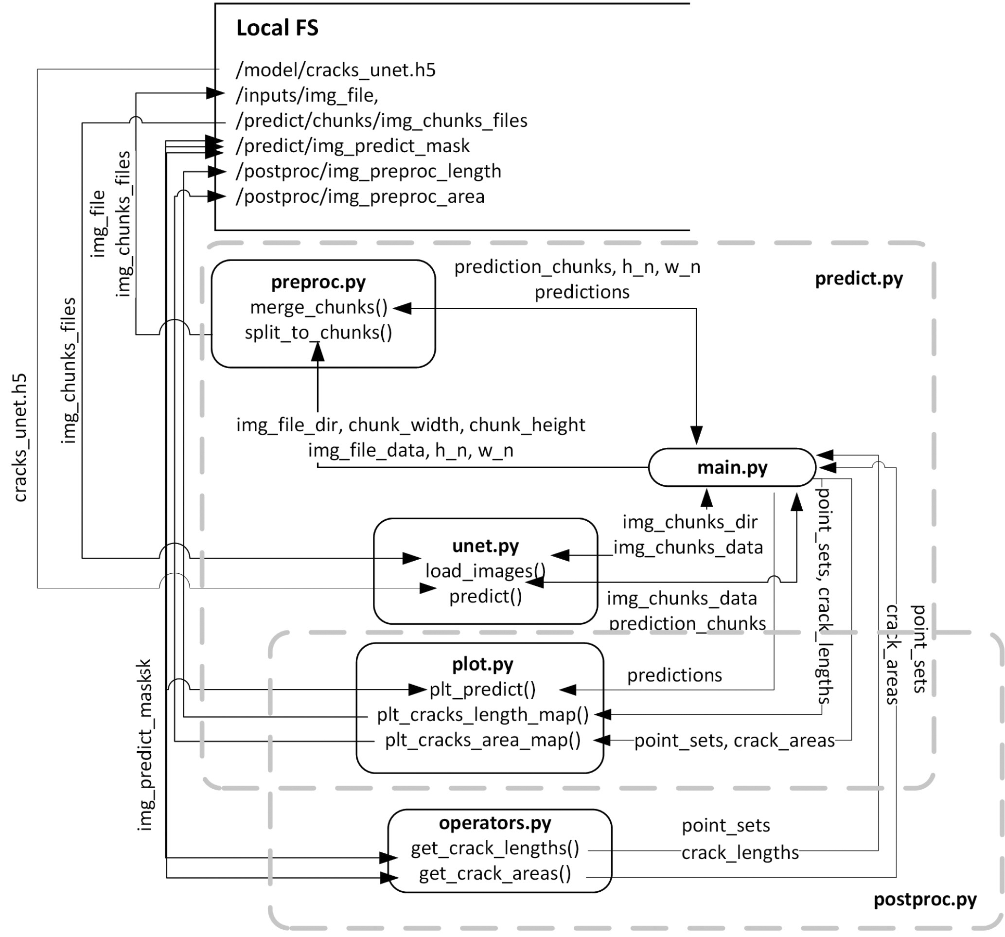 Рис. 12. DFS-диаграмма потоков данных процесса обнаружения трещин и расчета их длин и площадей.