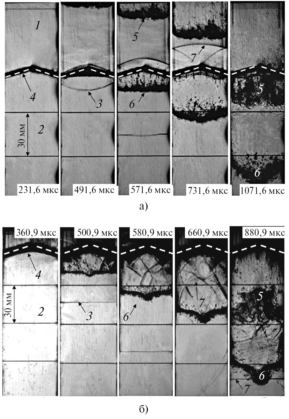 На рис. 2 и 3 представлены кинограммы некоторых экспериментов. На кинограммах М – число Маха падающей на КГ1 ударной волны.