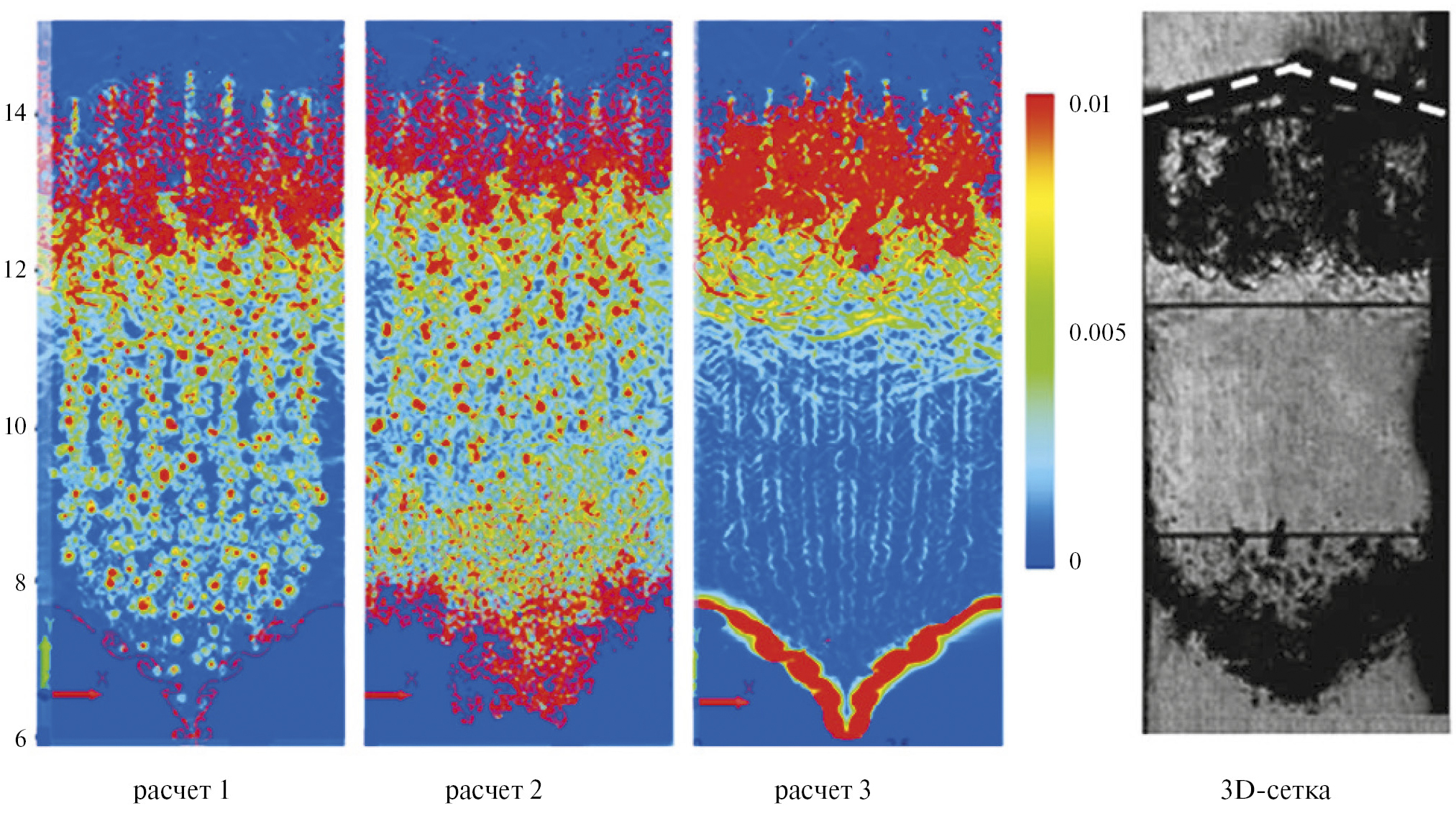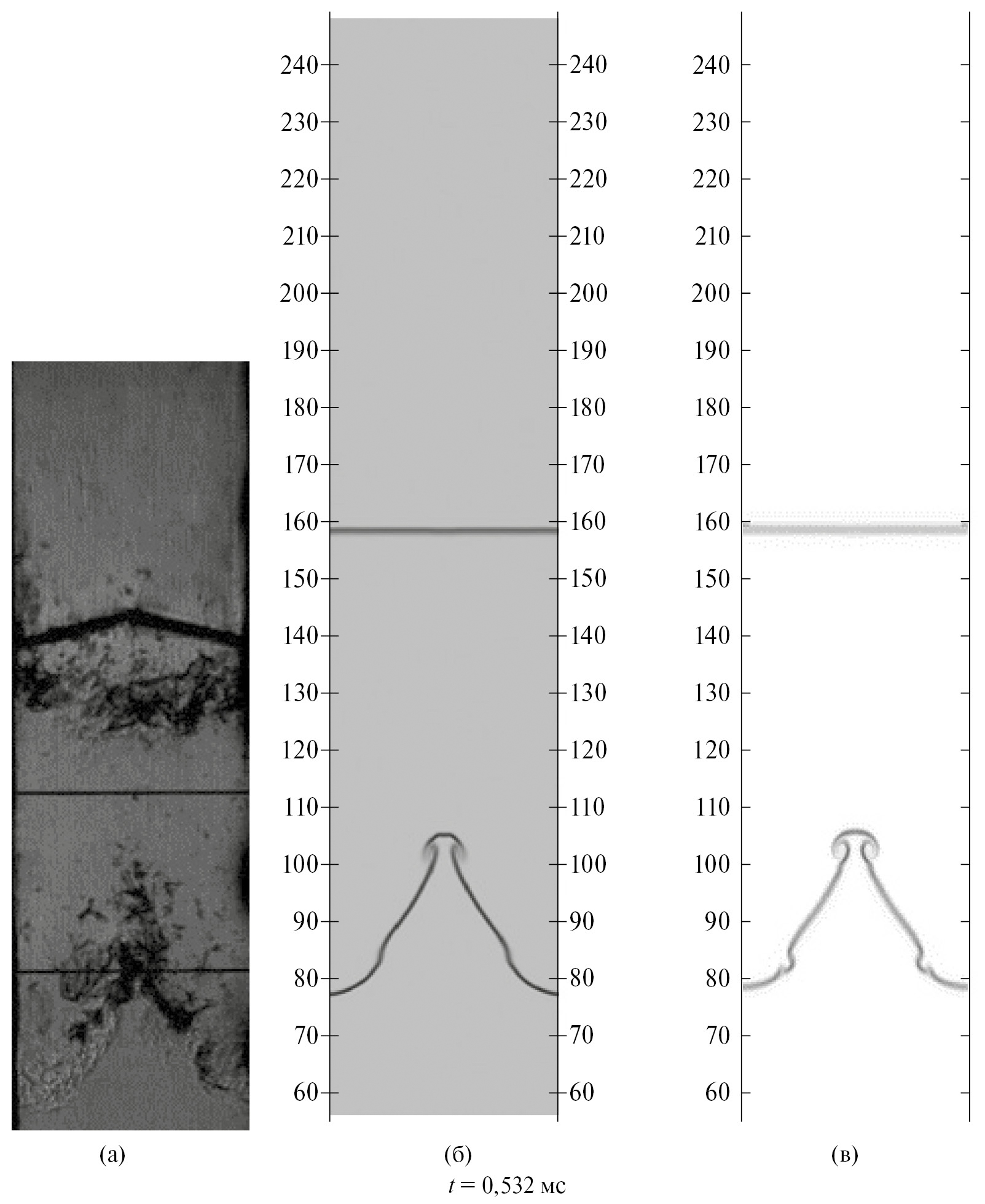 Математическое моделирование опыта №1 выполнялось в 2D-постановке по методике МИМОЗА с использованием уравнений Эйлера без привлечения каких-либо моделей учета ТП (ILES моделирование). Расчетная методика основана на лагранжево-эйлеровой стратегии и выделении веществ концентрациями (подробнее см. [41–44]). Такой подход является эффективным при моделировании задач механики сплошной среды с большими деформациями.