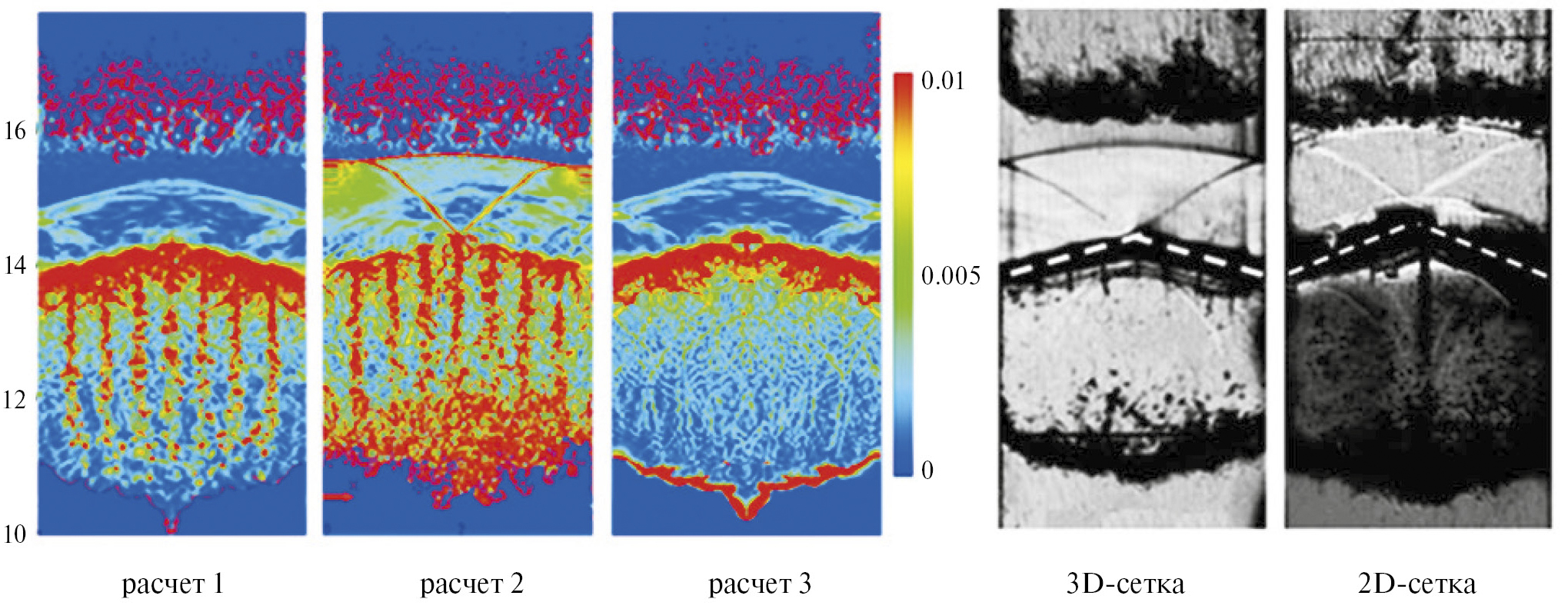 Однако имеются и более существенные отличия расчетов от экспериментов. Во всех расчетах есть небольшое отставание ударной волны, приходящей на место расположения проволочной сетки (рис. 7), по сравнению с экспериментальными данными, на рис. 9 видно, что расчетная ударная волна опережает экспериментальную. Наиболее согласующиеся с экспериментом данные получены в расчете 2 с учетом фрагментов пленки. В частности, на рис. 9 в расчете 2 отраженная от пленки волна (которая распространяется вверх по трубе) заметно ближе к экспериментальному положению. Еще более заметно, что в расчете 2 ЗТП на границе воздух–SF6 согласуется с экспериментальными данными, в то время как в расчете 1 она практически отсутствует, а имеются лишь завитушки вследствие проявления сдвиговой неустойчивости, а в расчете 3 ЗТП имеется, однако она значительно тоньше. Таким образом, пленка играет важную роль в данном течении и для корректного численного моделирования необходимо ее учитывать.