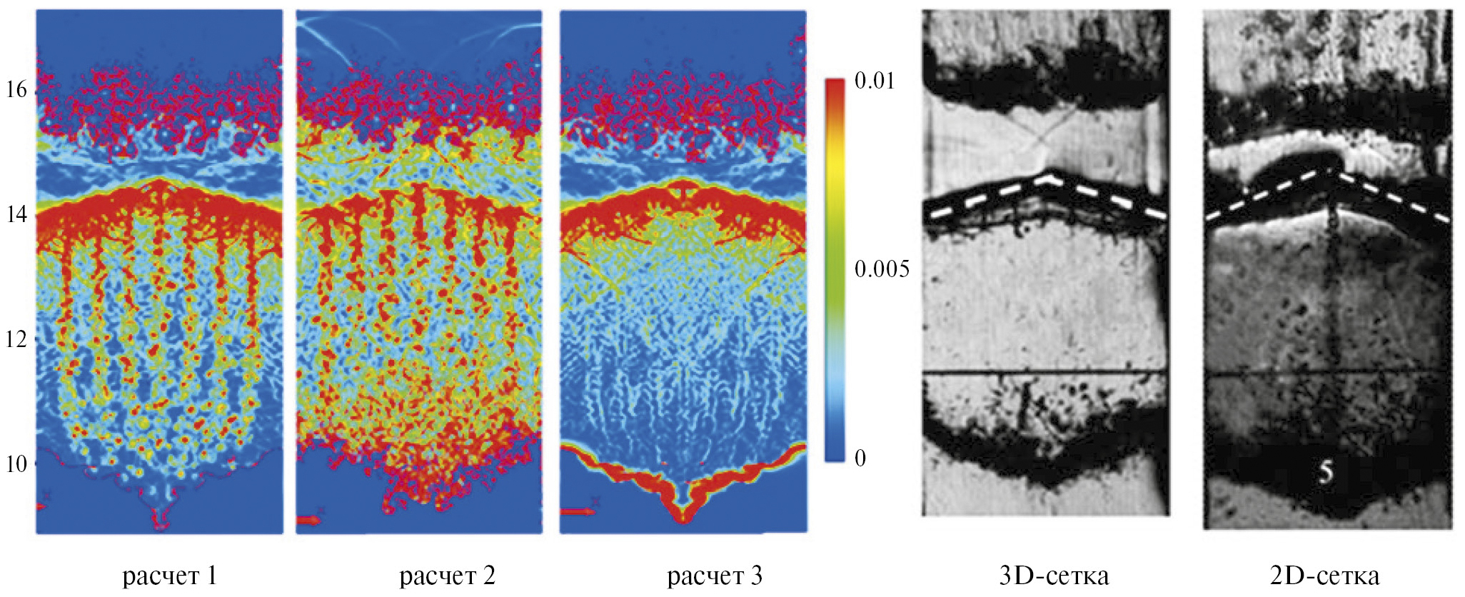 Отметим некоторые различия, имеющиеся в экспериментальных данных. Имеется некоторое опережение движения волн в эксперименте с 2D-сеткой. На рис. 7 видно, что ударная волна пришла на сетку на более раннее время по сравнению с 3D-сеткой. Такое небольшое отличие может быть следствием изменения сетки или же это вследствие экспериментальной погрешности в определении скорости ударной волны, движущейся по ударной трубе. Как бы там ни было, в этой ситуации от расчетов правомерно ожидать качественного согласия с экспериментальными данными, не претендуя на большую точность по времени. Кроме того, имеются отличия в интенсивности перемешивания и скорости распространения ЗТП вдоль трубы, что хорошо видно на рис. 10.