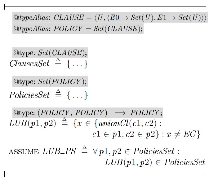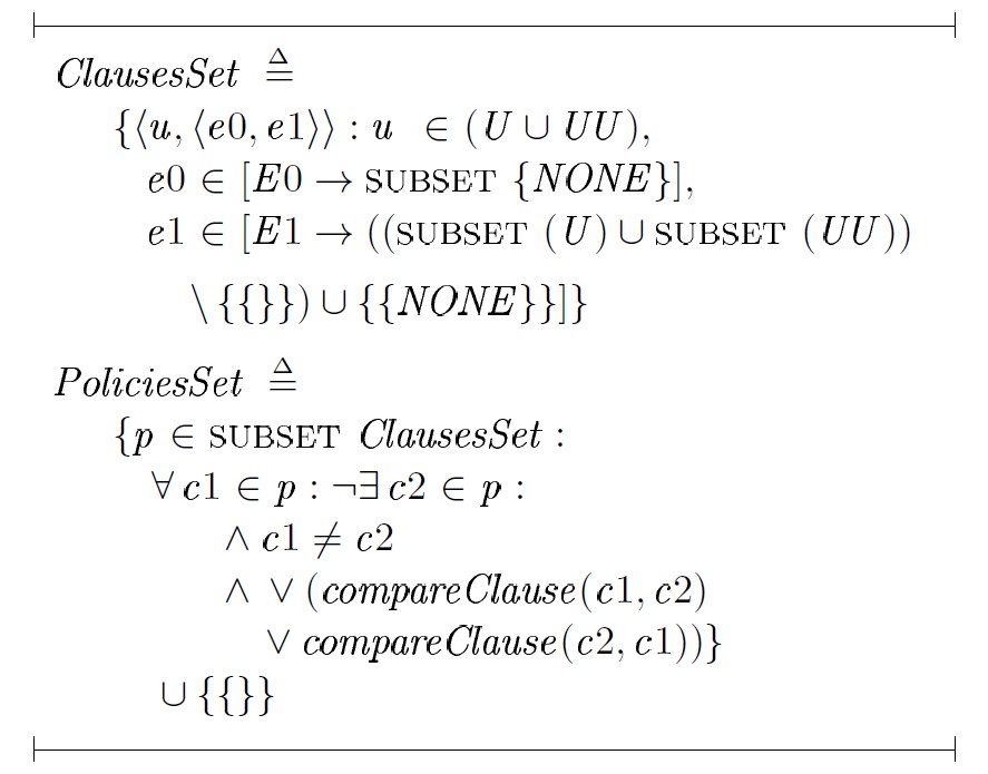 Отметим также, что определенной инновацией явилось использование подсистемы проверки типов Apalache [10] для доказательства инвариантов типов некоторых структур, используемых для описания предложений политик безопасности и самих политик в спецификациях TLA+. Это, в свою очередь, позволило обоснованно использовать в доказательствах некоторые неочевидные предположения.