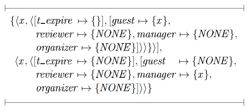 Здесь: x ∈ UU, t_expire ∈ E0, {guest, reviewer, manager, organizer} ⊆ E1, NONE — специальное значение, которое обозначает, что открытие блокировки не требуется (в TLA+ записи являются функциями, при этом частично определенные функции не поддерживаются).