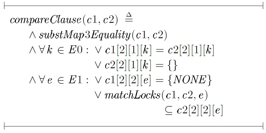 Оператор compareClause(c1, c2) возвращает значение TRUE – предложение c2 является как минимум таким же строгим, как и предложение c1 — если выполняются два условия: а) существует подстановка, приводящая предикат Flow(·) предложения c1 к виду, идентичному предикату Flow(·) предложения c2; б) после применения соответствующей подстановки к блокировкам предложения c1 множество блокировок предложения c1 будет представлять подмножество блокировок предложения c2. Логическая интерпретация заданного таким образом отношения частичного порядка приводится в [4].