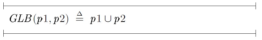 Наиболее важными правилами семантиками языка Paralocks являются правила вычисления наименьшей верхней (НВГ) и наибольшей нижней граней (ННГ) двух заданных политик безопасности. ННГ двух произвольных политик безопасности p1 и p2 является некоторая максимально строгая политика pGLB, такая, что pGLB ⊆ p1 и pGLB ⊆ p2. Поскольку каждое предложение политики представляет собой отдельную возможность возникновения разрешенного информационного потока, очевидно, справедливо: