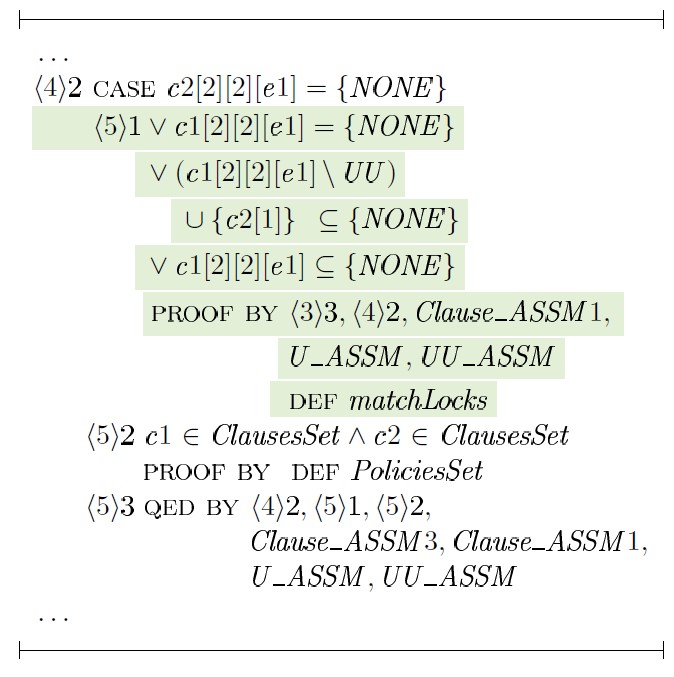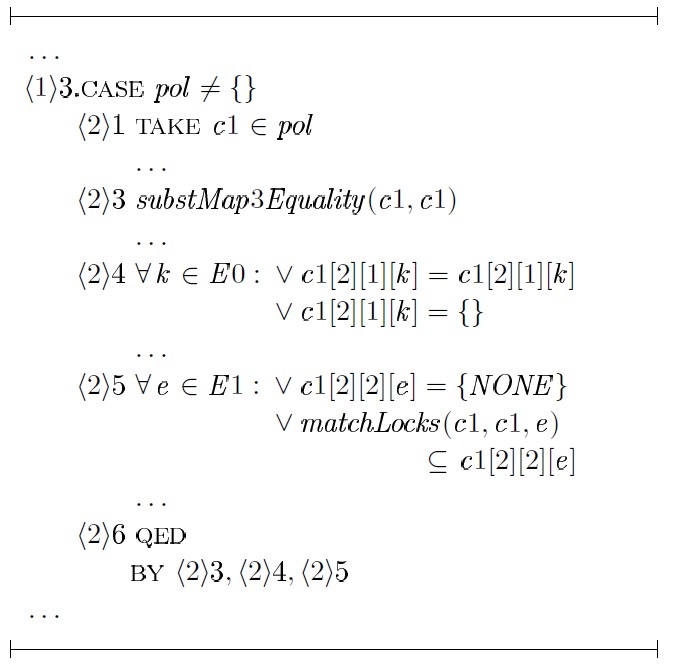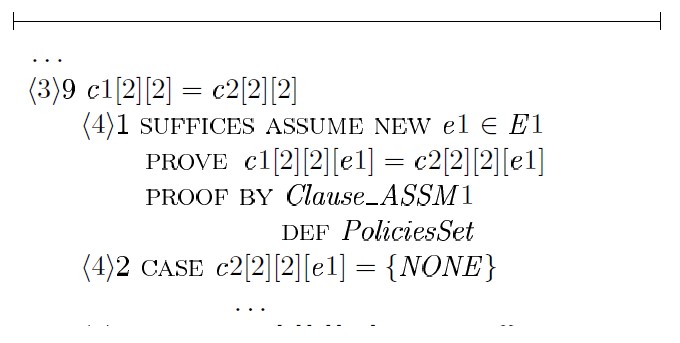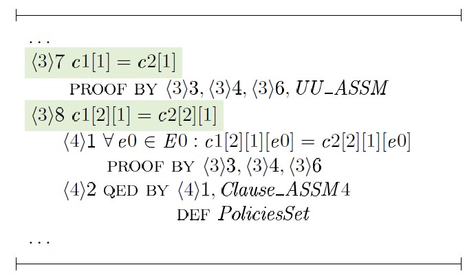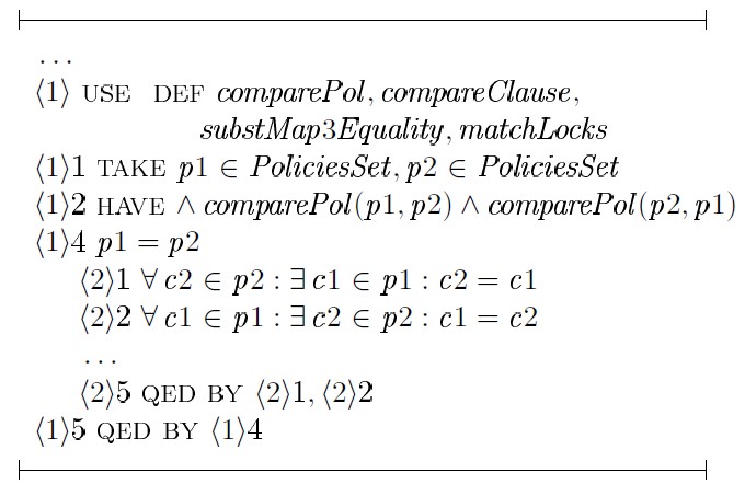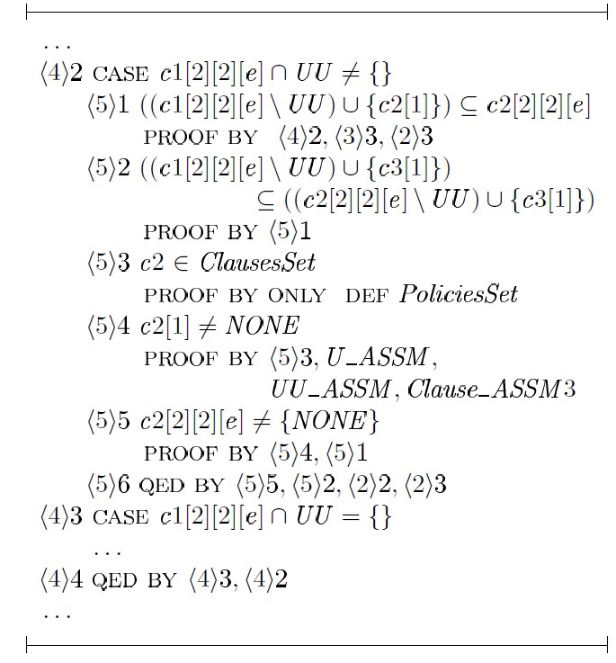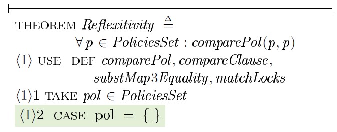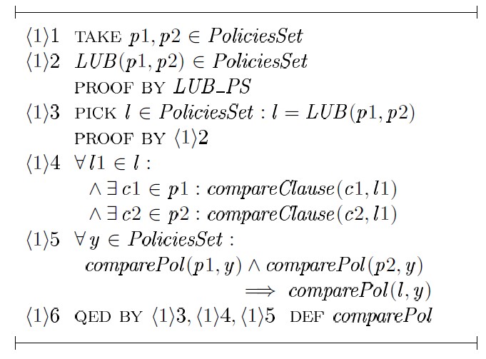 Доказательство шага ⟨1⟩ 4 строится на том факте, что любое предложение политики l является результатом применения некоторой подстановки к блокировкам предложения c1 или c2 с последующим объединением блокировок этих предложений — unionCl (c1,c2), где c1 ∈ p1 и c2 ∈ p2. Для доказательства шага ⟨1⟩ 5 в общем виде необходимо выбрать произвольную политику y ∈ PoliciesSet, произвольное предложение y1 ∈ y и доказать: ∃c1, c2, l1 : c1 ∈ p1 ∧ c2 ∈ p2 ∧ l1 ∈ l (c1 ⊆ y1 ∧ c2 ⊆ y1 => l1 ⊆ y1):