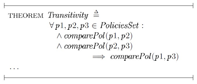 Выбрав p1, p2, p3 из PoliciesSet и положив: comparePol(p1,p2) ∧ comparePol ( p2, p3), необходимо доказать: ∀c3 ∈ p3: (∃c1 ∈ p1 : compareClause(c1,c3)) [2]: