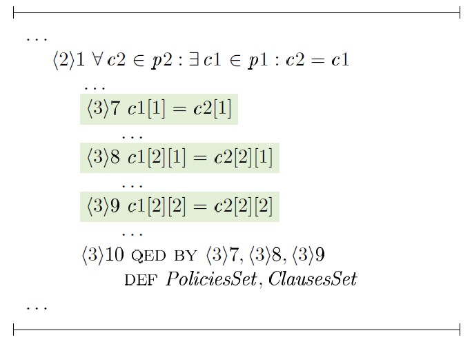 Поскольку выражение политики безопасности не может содержать двух различных предложений c1 и c2, таких, что c1 ⊆ c2 или c2 ⊆ c1, для доказательства шага ⟨3⟩ 6 достаточно доказать, что c3 ⊆ c2: