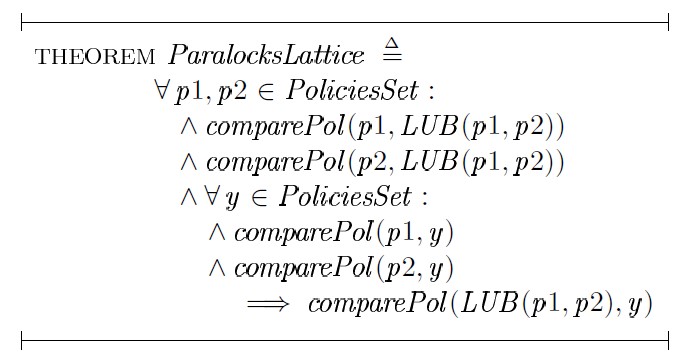 Предположим, что заданная ранее функция LUB (·) действительно является функцией нахождения наименьшей верхней грани двух политик безопасности, и сформулируем в виде теоремы утверждение о том, что множество PoliciesSet с заданным на нем отношением частичного порядка comparePol(·) представляет собой алгебраическую решетку:
