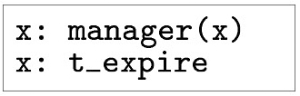 Например, выражение политики: “Поток к произвольному пользователю x возможен, если а) открыта блокировка guest — для x задана роль guest – и открыта блокировка t_expire – истек заданный интервал времени или б) открыта блокировка manager — для x задана роль manager” – имеет формальный вид:
