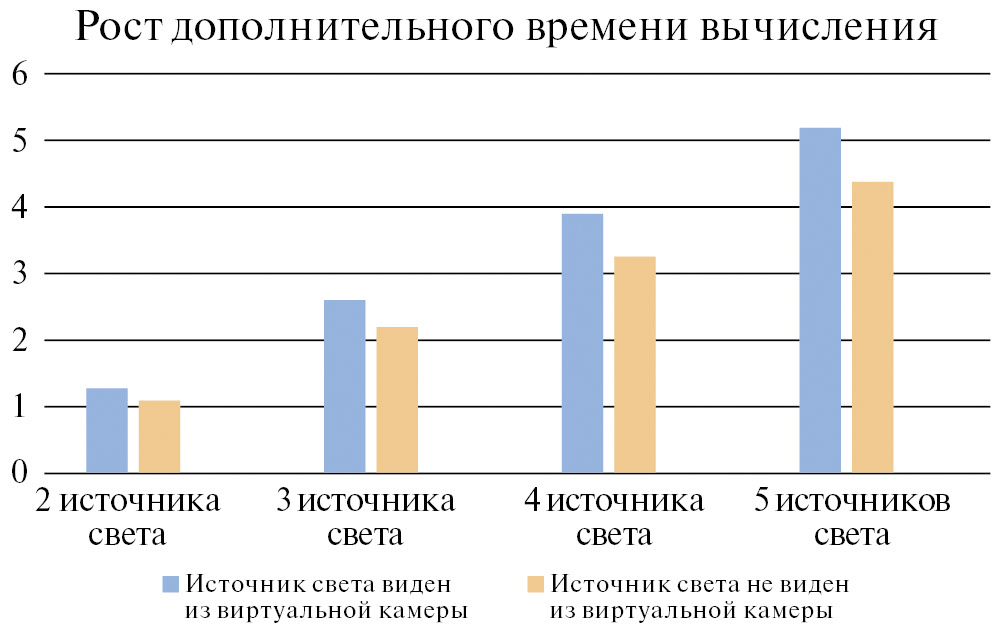 В табл. 1 показаны данные для одного источника света, расположенного в том же полушарии, что и камера. Каждый новый источник освещения требует дополнительных вычислений, которые растут линейно. Рост дополнительного времени вычислений (ордината, в миллисекундах) показан на рис. 7.