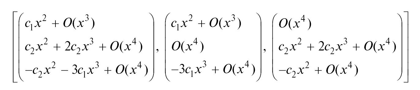 Для системы на рис. 2 множество всех усеченных лорановых решений выписано на рис. 3. При сравнении (6) и рис. 3 видим, что некоторые продолжения заданной системы могут иметь множества усеченных лорановых решений, для представления которых требуется использовать большее количество произвольных постоянных, чем требуется для представления множества усеченных решений исходной системы. В этом случае возможна ситуация, что некоторый инвариантный коэффициент найденного усеченного лоранового решения заданной системы совпадает с начальными членами усеченного решения некоторого продолжения заданной системы в том случае, когда дополнительная произвольная постоянная берется равной нулю, а при других значениях этой дополнительной произвольной постоянной этот коэффициент может иметь иное значение. Это также означает, что не любое усеченное решение продолжения заданной системы является продолжением усеченного решения заданной системы, несмотря на то, что любое усеченное решение заданной системы имеет продолжение среди решений любого продолжения заданной системы.