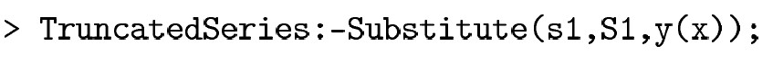 Дополнительно нами была реализована вспомогательная процедура Substitute, которая принимает на вход решение (или предполагаемое решение) системы в том виде, в котором выдается результат процедуры LaurentSolution, а также систему и имя, обозначающее вектор-столбец неизвестных в системе (аналогично аргументам процедуры LaurentSolution). Процедура подставляет в систему каждый из вектор-столбцов из набора в решении и выдает результаты подстановки в виде усеченных рядов. Также в качестве первого аргумента возможна передача не набора а только одного из векторов.
