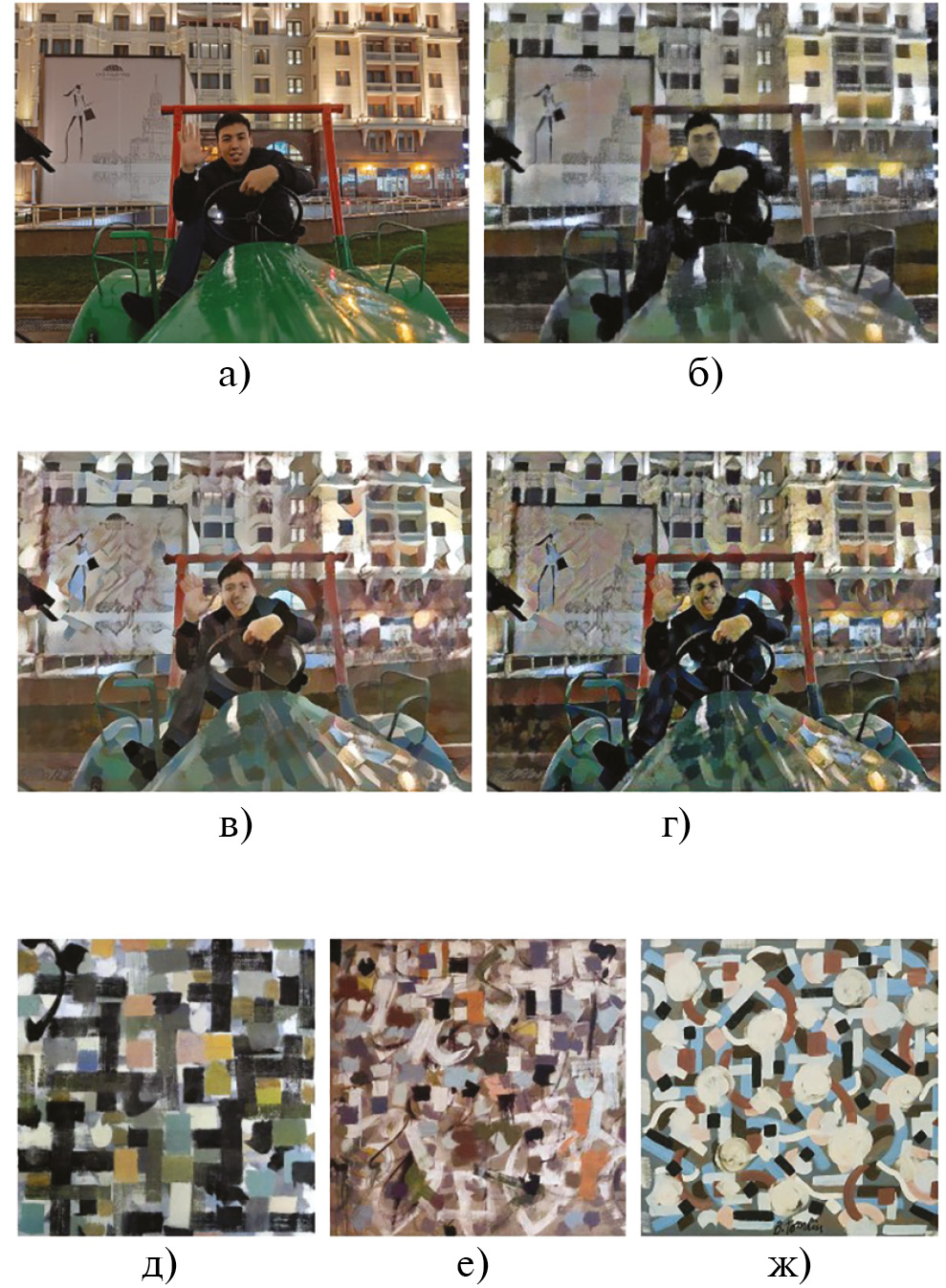 Рис. 4. Пример работы алгоритма стилизации по группе найденных стилей с переносом цветовой схемы исходного стиля: a) контент; (б) стандартная стилизация контента a) по стилю д); в) предложенная стилизация по группе найденных стилей е), ж); г) предложенная стилизация по группе стилей с перекрашиванием е), ж); д) пользовательский стиль; е), ж) похожие на (e) стили