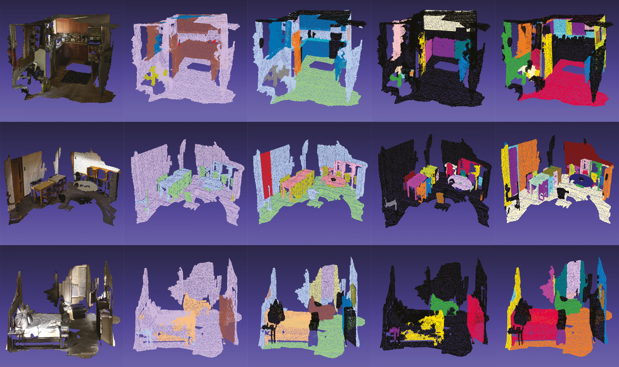 Рис. 6. Сегментированные облака точек и восстановленные 3D-модели сцен