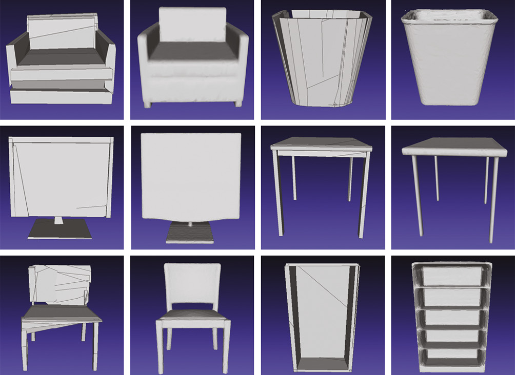 В процессе тестирования использовалась выборка, включающая в себя восемь категорий объектов: стол, стул, книжная полка, диван, мусорное ведро, шкаф, дисплей и ванна (табл. 1). Для формирования этой выборки применялся метод TSDF Fusion, который позволяет восстанавливать 3D-поверхности объектов на основе набора RGB-D-изображений. Метод TSDF Fusion применяет специальное скалярное поле, которое хранит расстояние от каждой точки в пространстве до ближайшей поверхности. Этот метод объединяет несколько таких полей, полученных с разных точек зрения, в одно общее поле. Затем общее поле преобразуется в полигональную сетку с помощью алгоритма Marching Cubes. Благодаря методу TSDF Fusion возможно получение гладких и водонепроницаемых сеток из шумных и неполных данных.