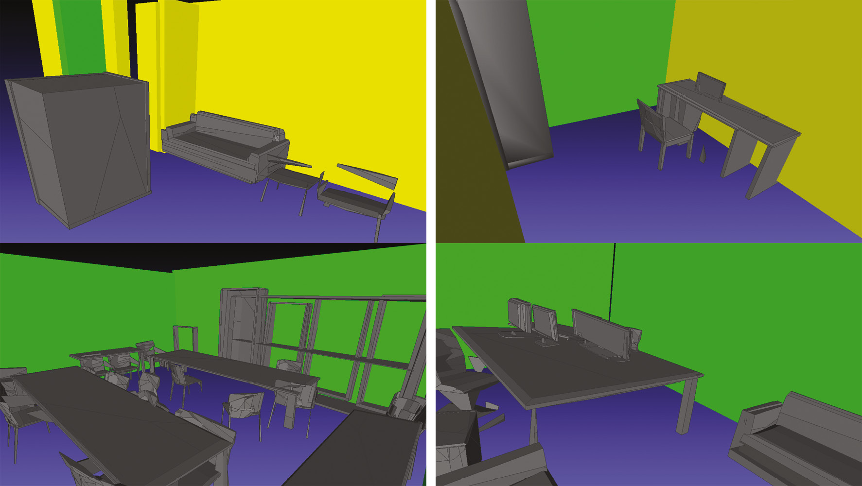 После определения формы, ориентации и расположения объектов на сцене эти данные собираются в полноценную 3D-модель. Модель, представляющая собой полигональную сетку, создается на основе предсказанных 3D-форм объектов и прямоугольников макета. Пример такой интегрированной 3D-модели сцены можно увидеть на рис. 5.